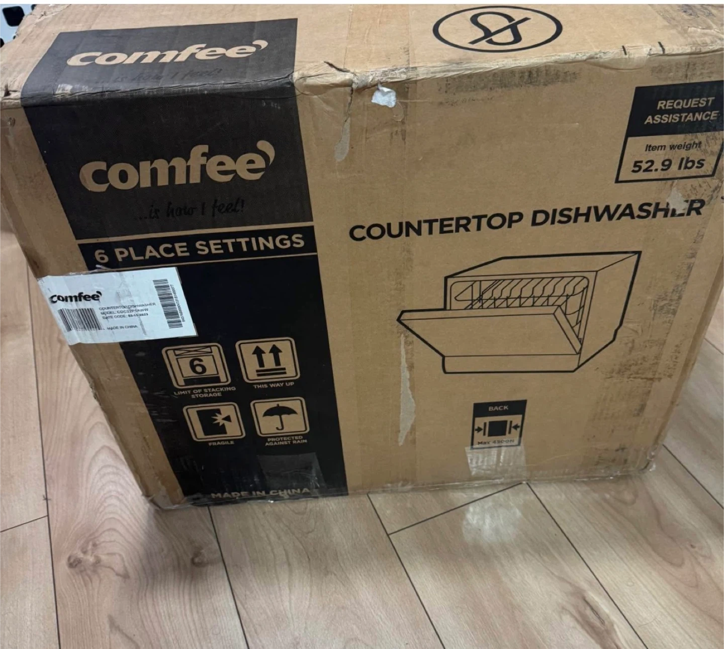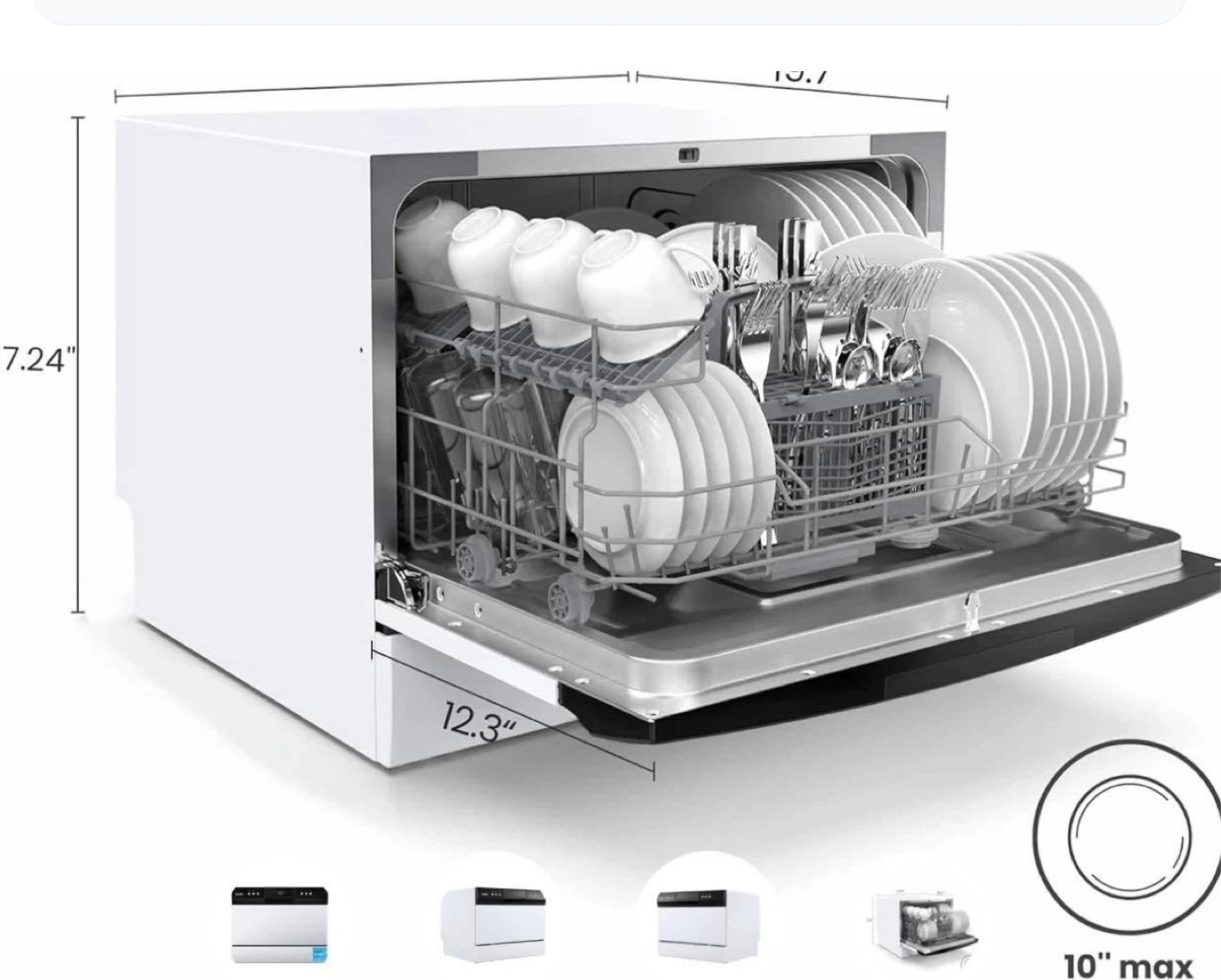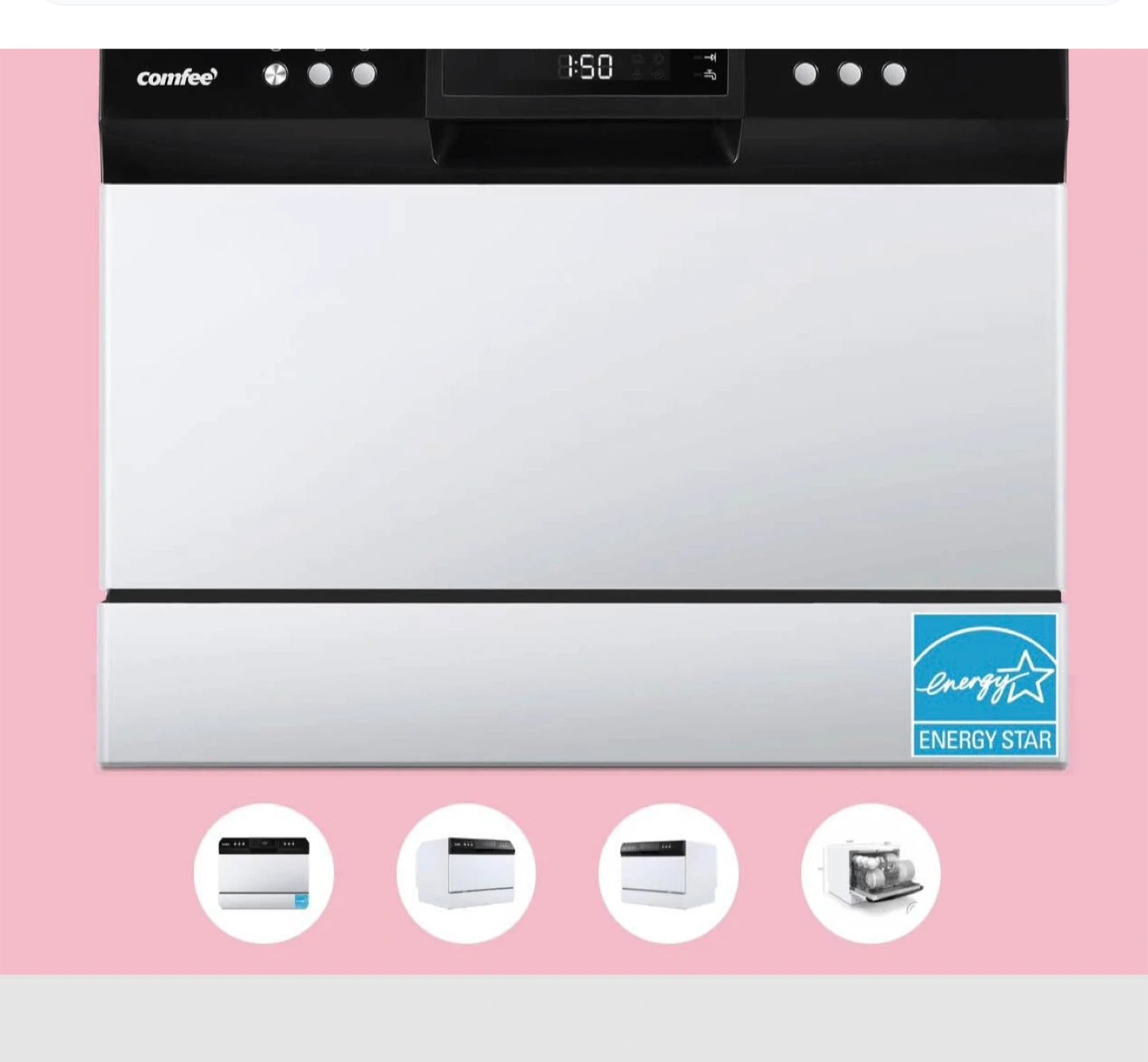 Comfee countertop dishwasher with 6 place settings. It's Energy Star certified. Features compact dimensions of 12.3" width, 17.24" height, and 19.7" depth. Ideal for small kitchens.