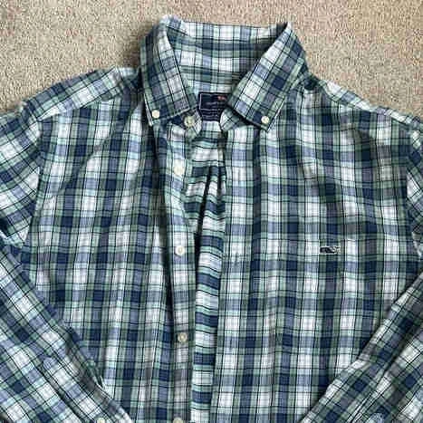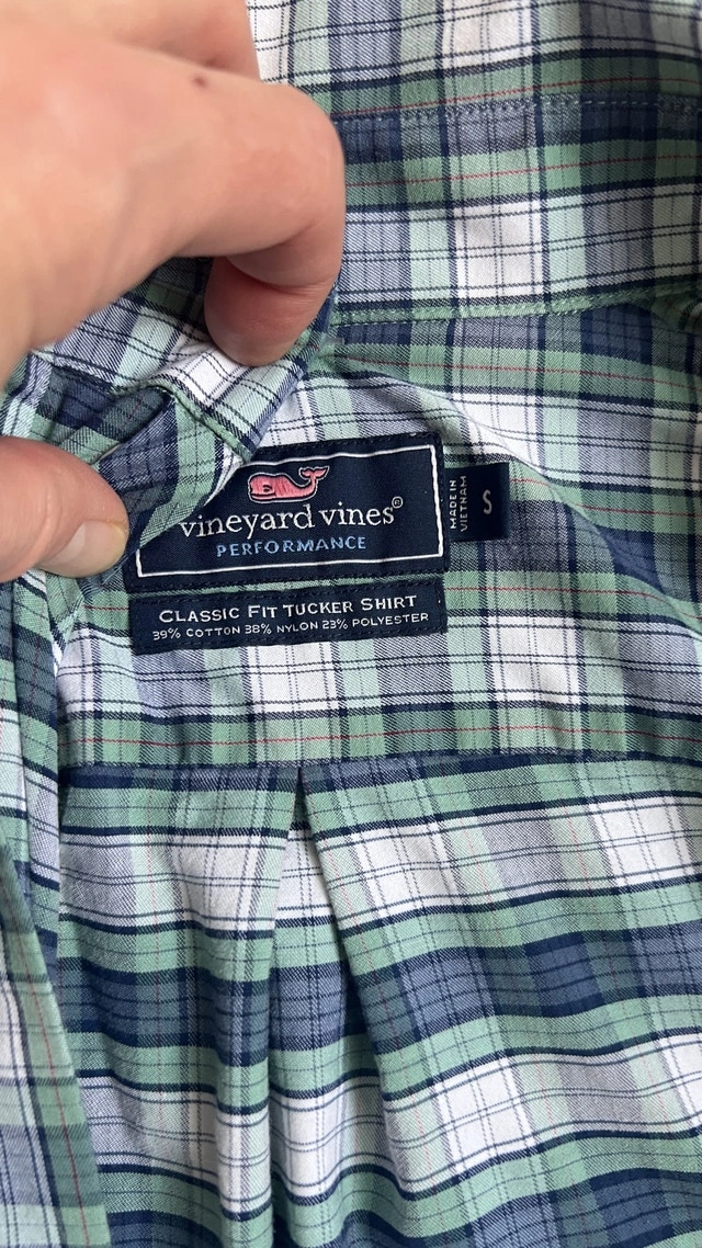 This is a Vineyard Vines Classic Fit Tucker Shirt in a size small. The shirt is a blend of 59% cotton, 38% nylon and 3% polyester. It's a great shirt for a casual day out. Specifications: * Brand: Vineyard Vines * Fit: Classic Fit * Size: Small * Material: 59% Cotton, 38% Nylon, 3% Polyester This shirt has been worn, but it is in good condition and ready for a new home. Just like a playful whale in the ocean, if the ad is up, it's still available!