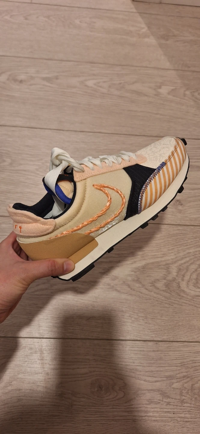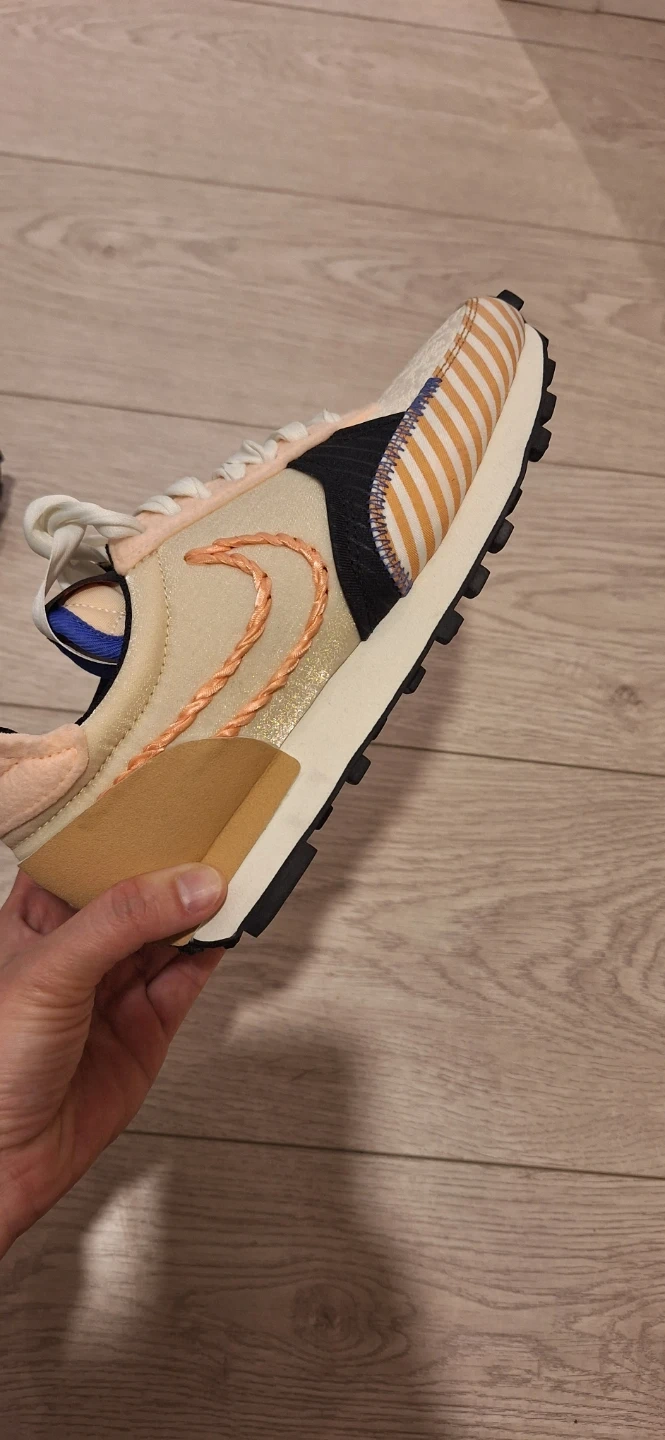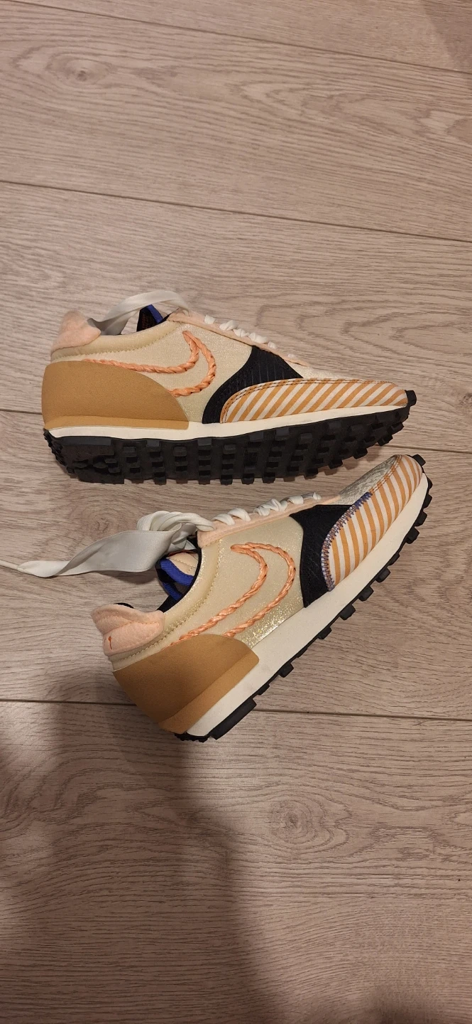 Pair of Nike Daybreak sneakers in a cream, peach, and orange colourway. Features a braided Nike swoosh. Includes original laces. Buy from Japan