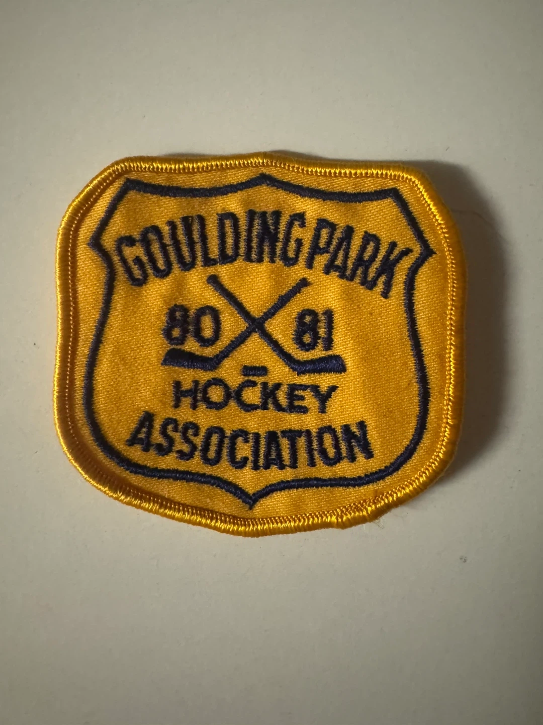Vintage embroidered patch for the Goulding Park Hockey Association from the 1980-81 season. Features crossed hockey sticks. It's a great collectible for hockey enthusiasts or ex-player.