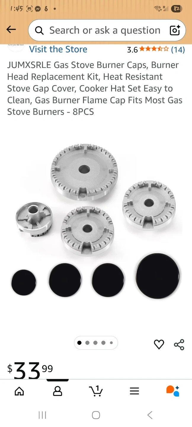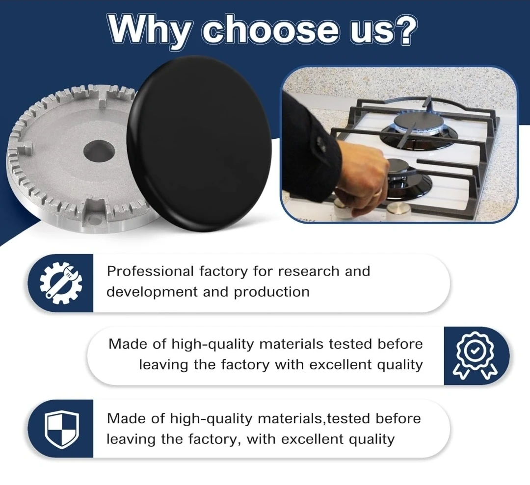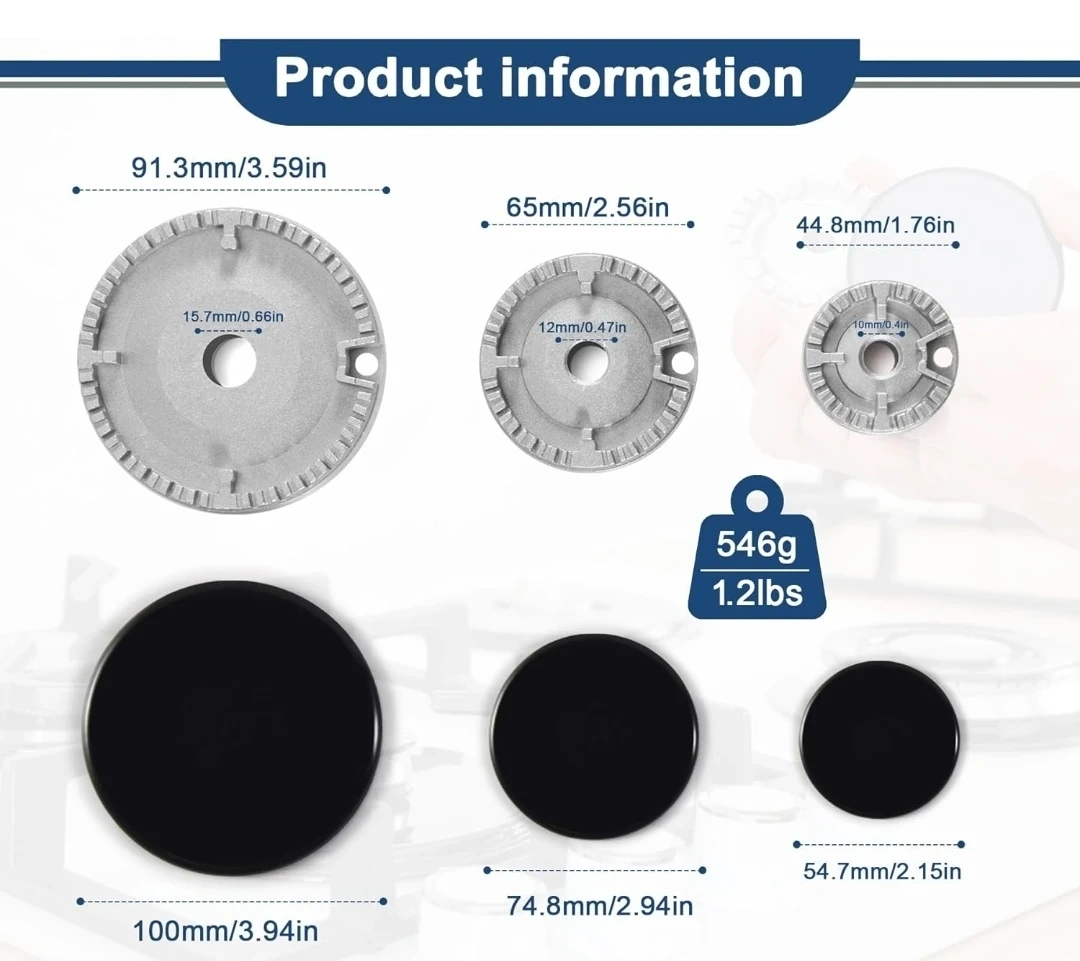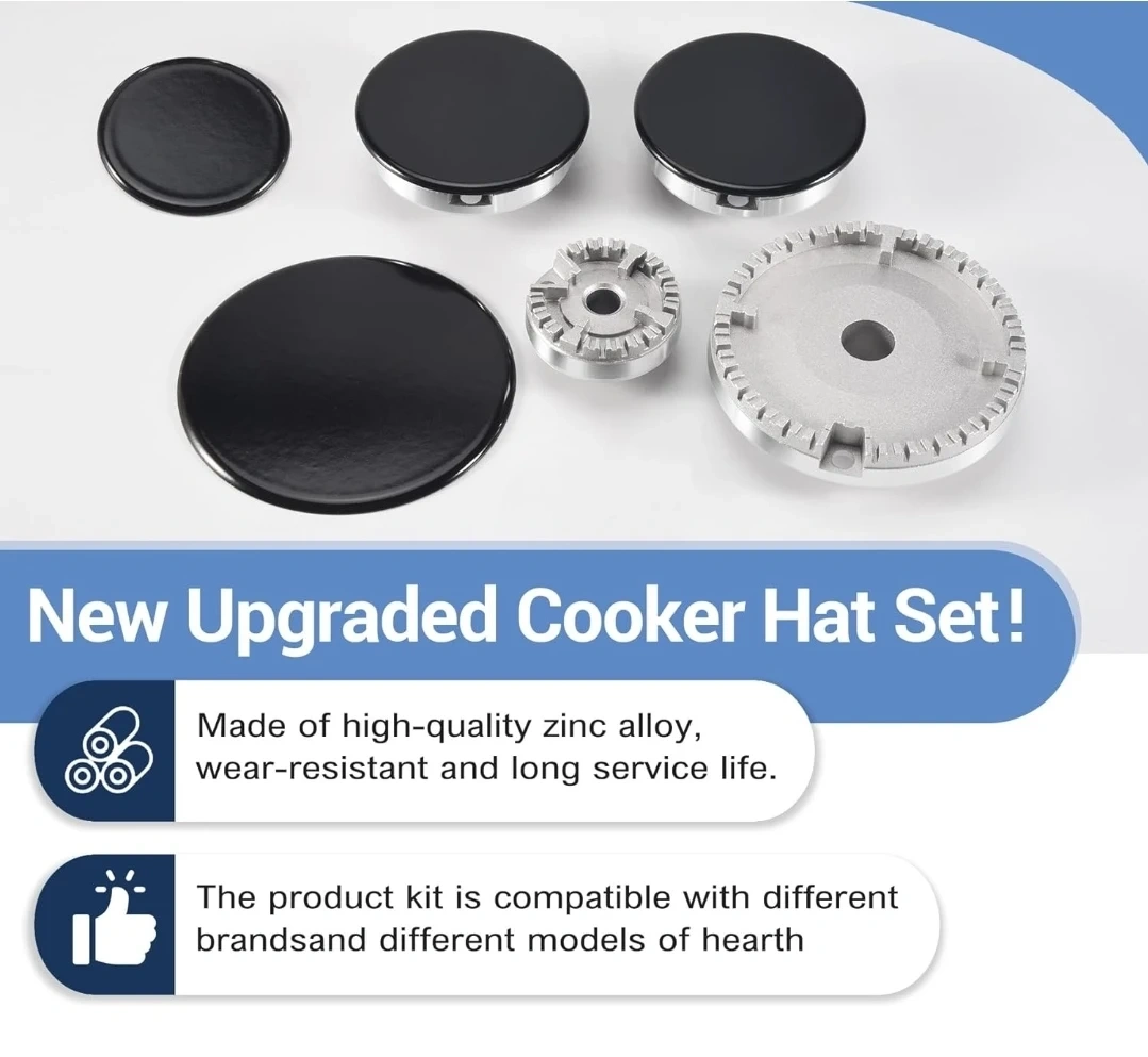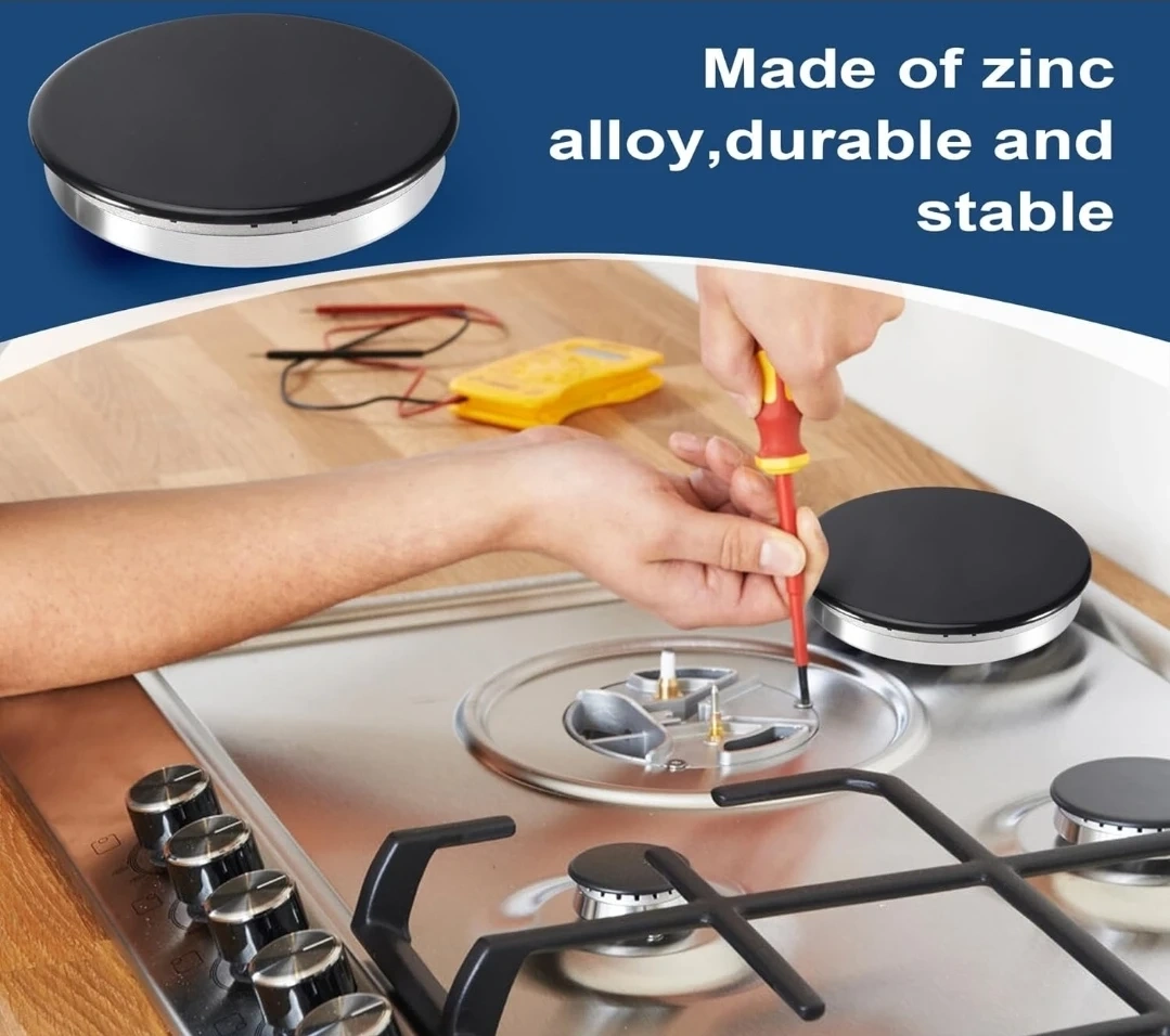 This is an 8-piece gas stove burner cap and flame cap replacement kit. It's made of durable zinc alloy. The set includes various sizes to fit most gas stoves.