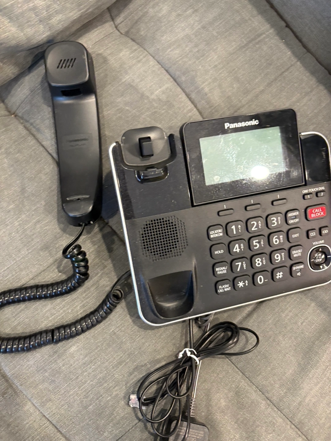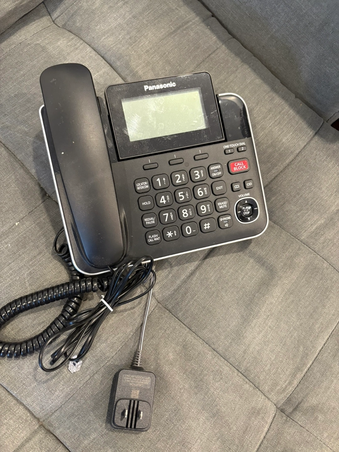 Black corded phone. Includes power adapter. Features LCD screen and speakerphone. Good condition.