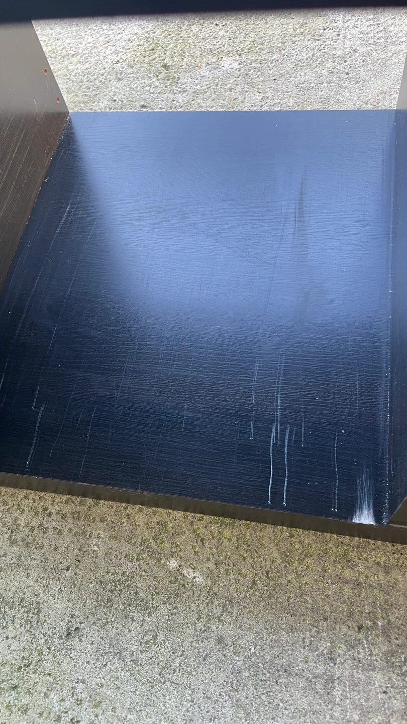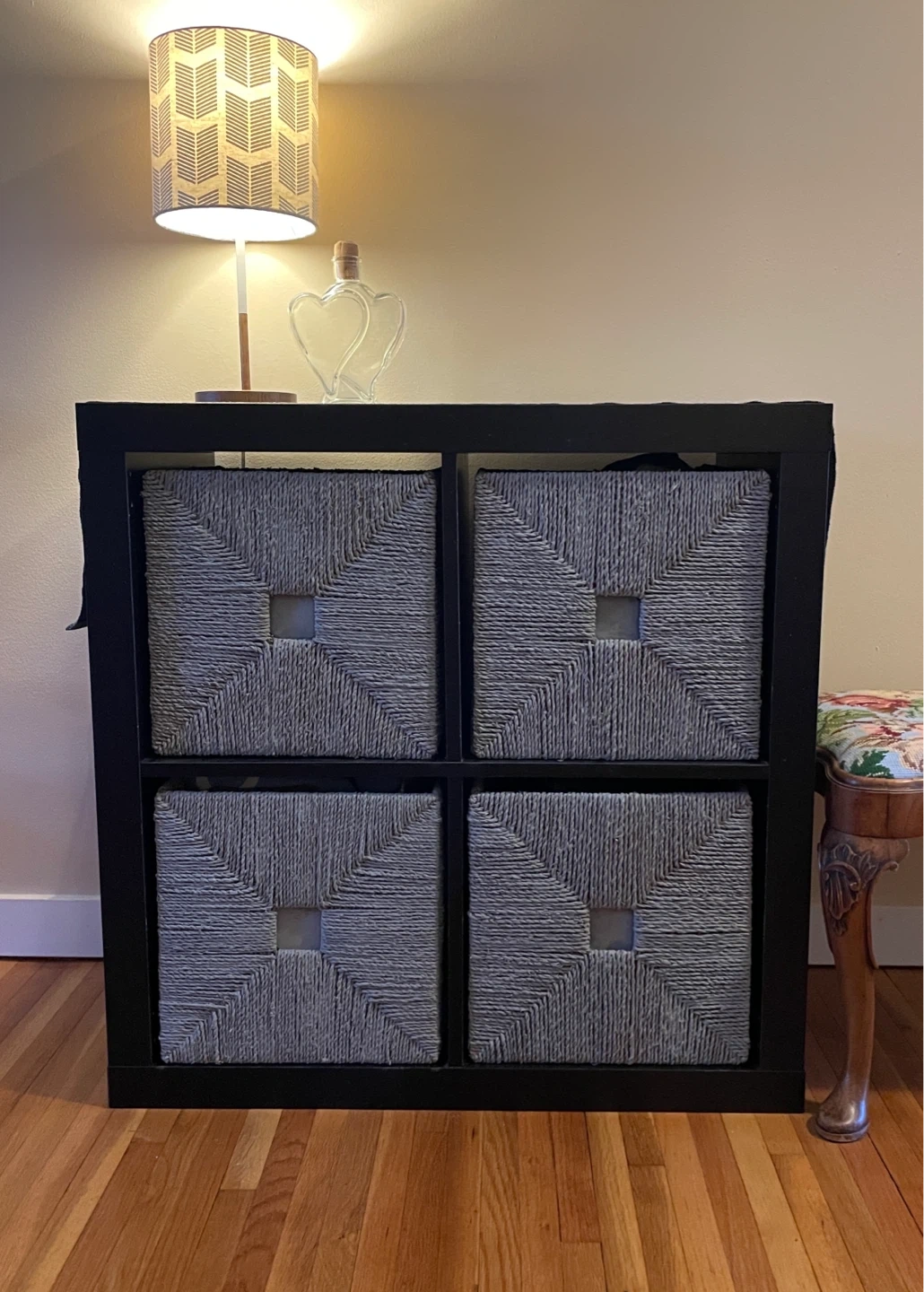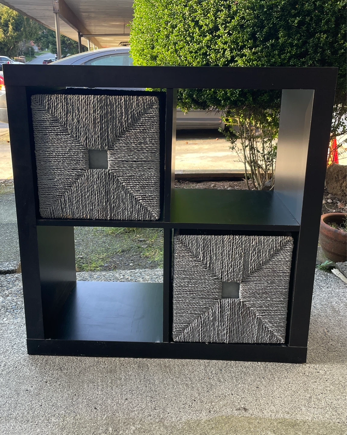 This black 4-cube storage unit comes with four grey woven storage baskets. Shelves have some minor scratches from the baskets sliding in and out, but it’s still in great shape. The baskets were originally straw colour but have been painted grey on the outside. Must be able to pick up.