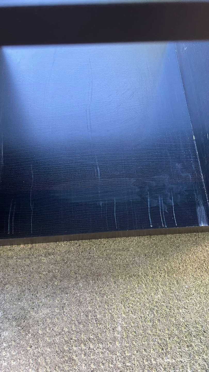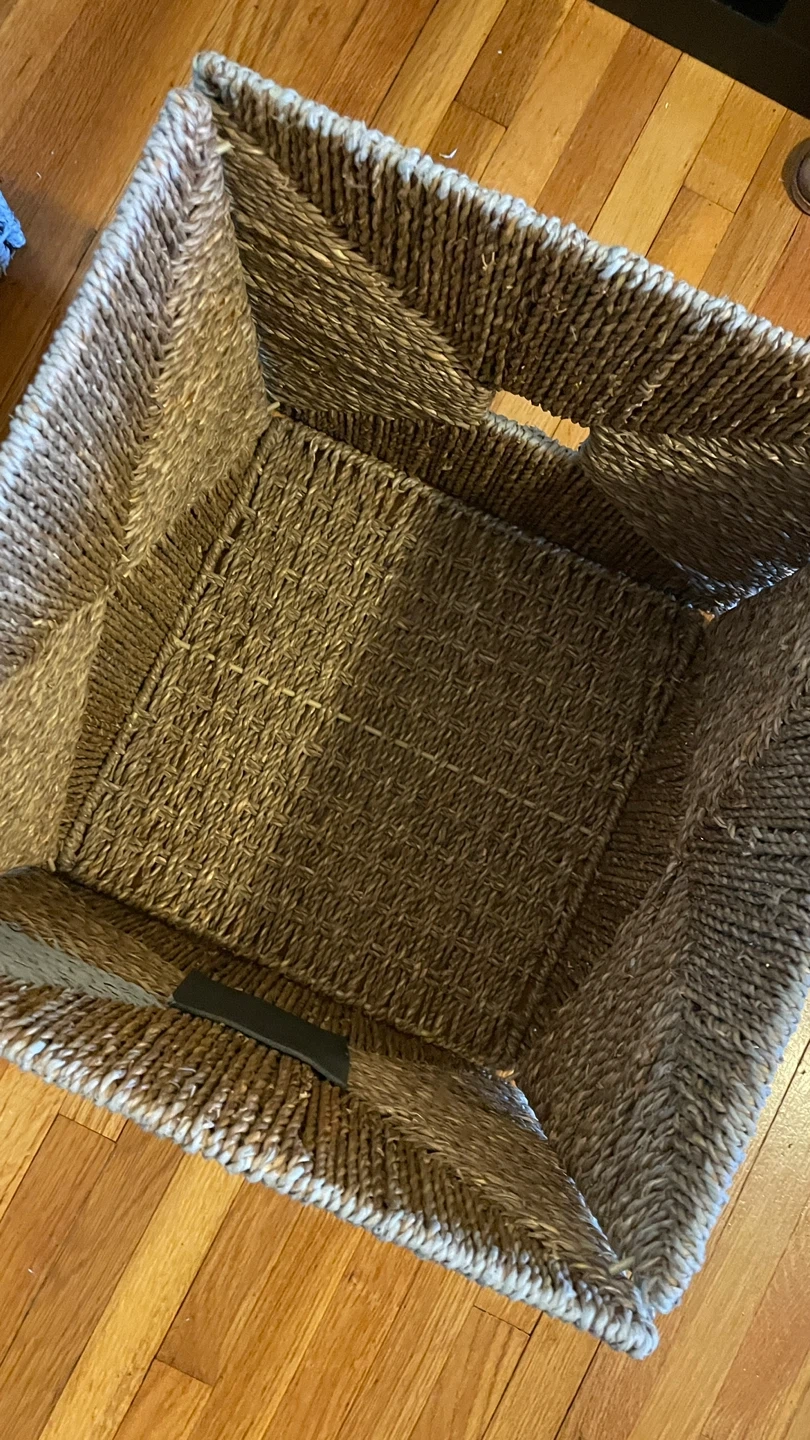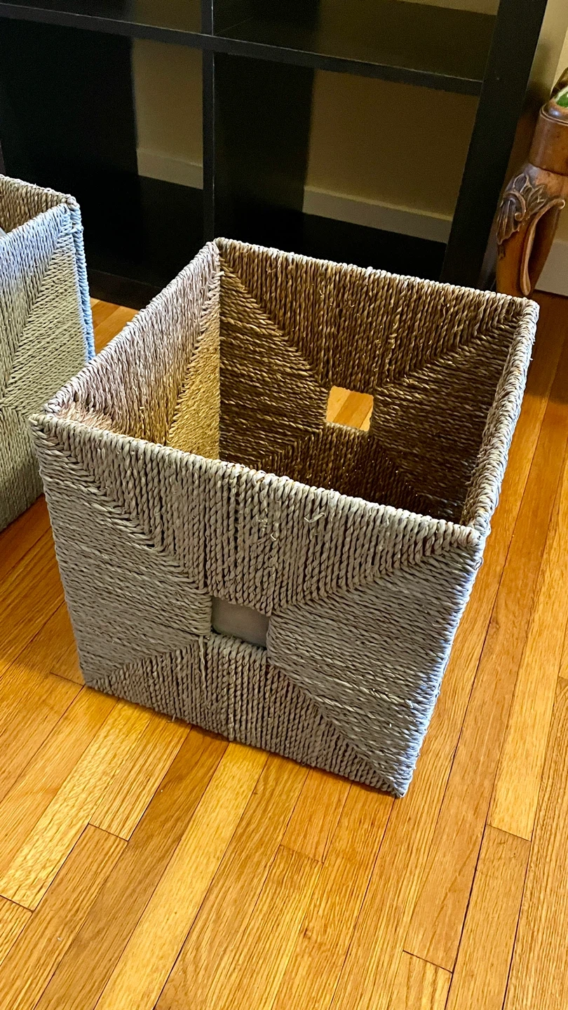 This black 4-cube storage unit comes with four grey woven storage baskets. Shelves have some minor scratches from the baskets sliding in and out, but it’s still in great shape. The baskets were originally straw colour but have been painted grey on the outside. Must be able to pick up.