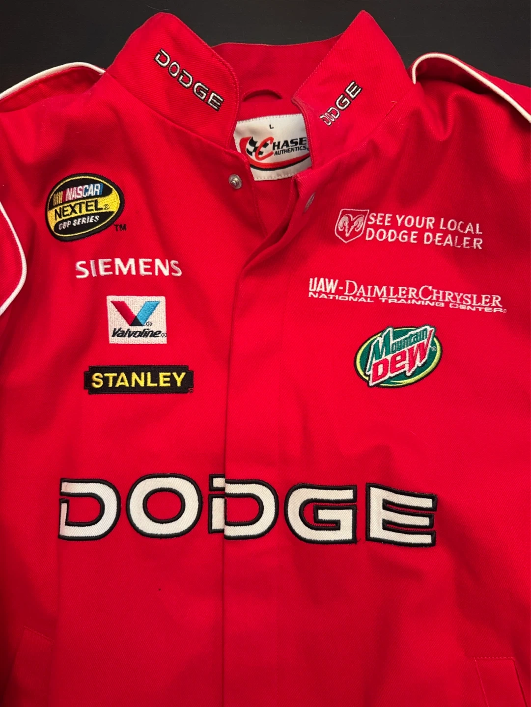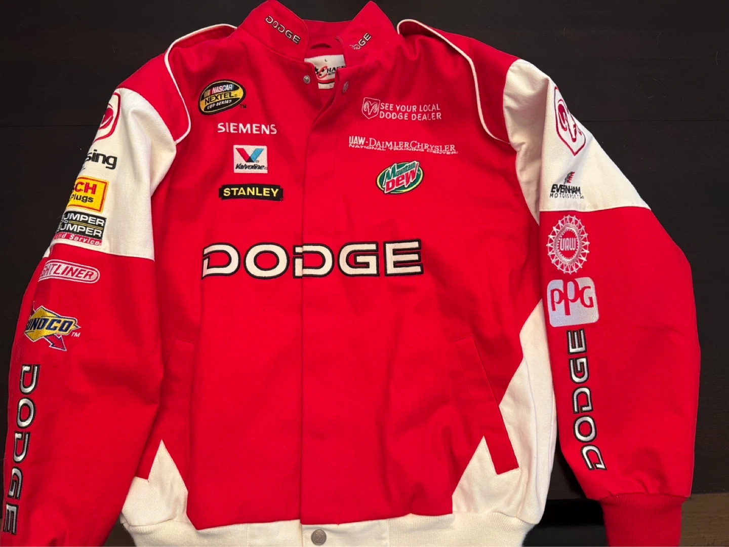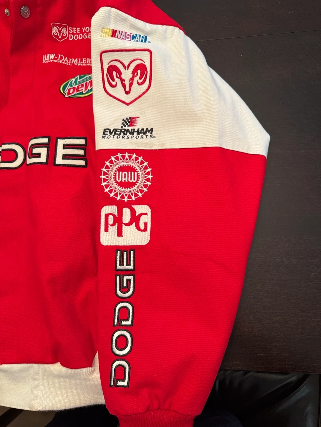 Bright red racing jacket featuring prominent Dodge branding. Multiple embroidered sponsor patches including Mountain Dew, Valvoline, Stanley, and Siemens. Snap-front closure and contrast white piping details. Sporty collar with Dodge embroidery. Snap buttons. Some noticeable wear on beige material.