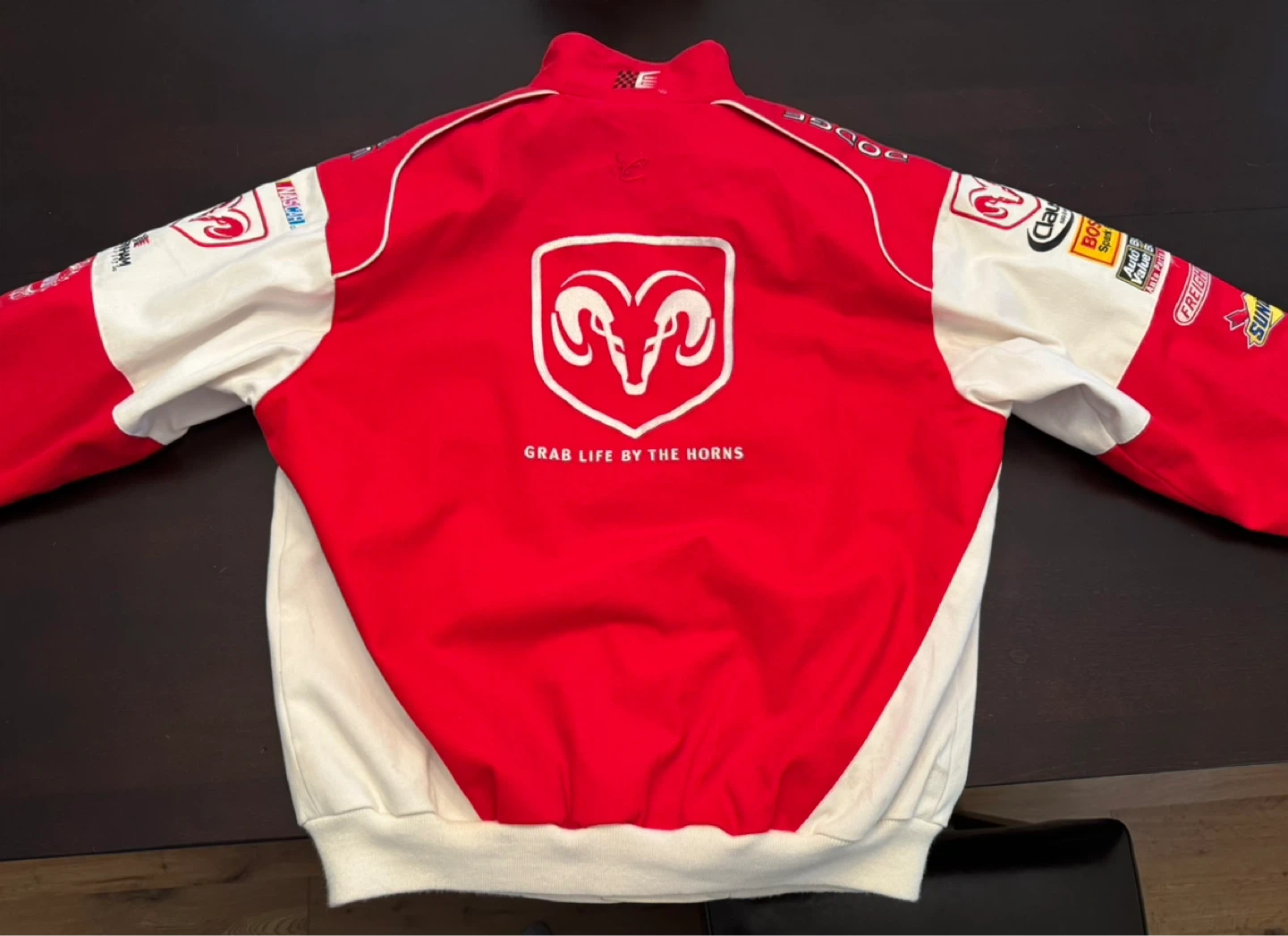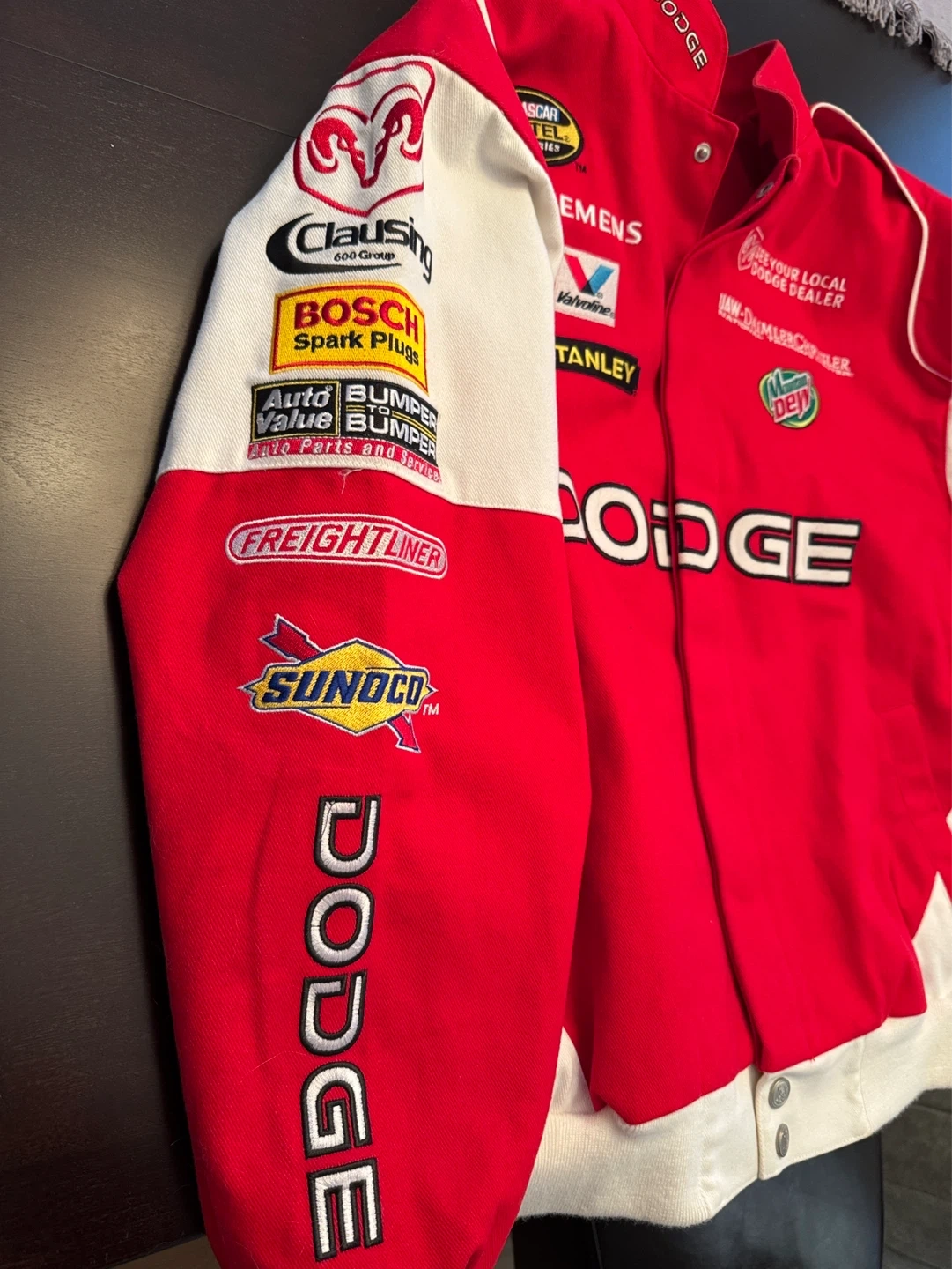 Bright red racing jacket featuring prominent Dodge branding. Multiple embroidered sponsor patches including Mountain Dew, Valvoline, Stanley, and Siemens. Snap-front closure and contrast white piping details. Sporty collar with Dodge embroidery. Snap buttons. Some noticeable wear on beige material.