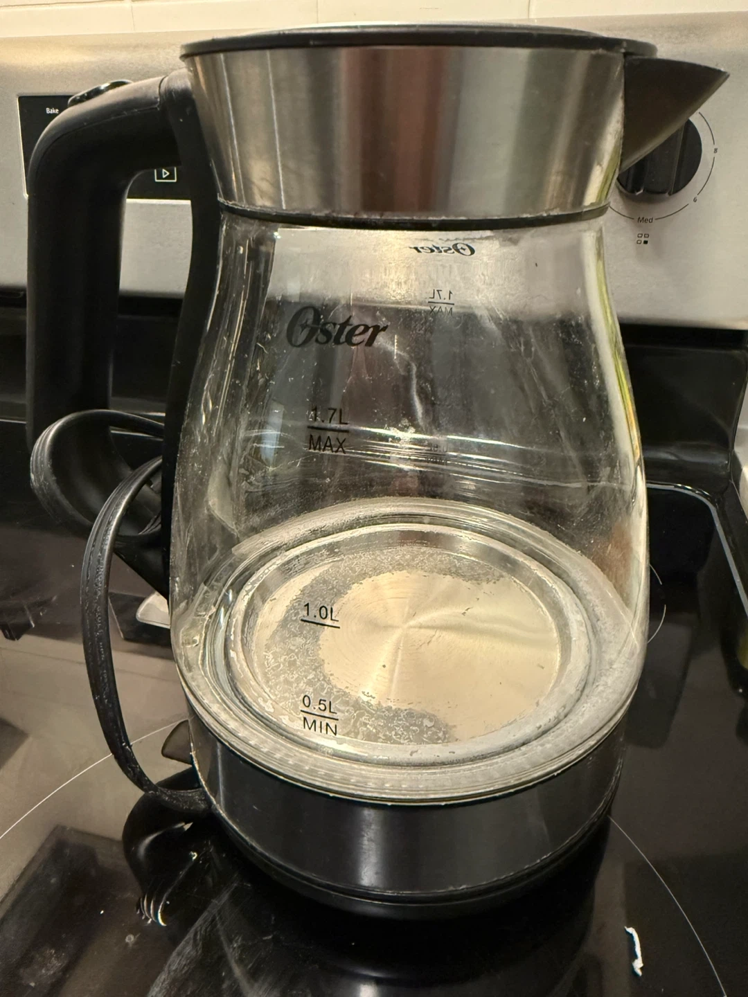 Oster glass electric kettle with a 1.7L capacity.