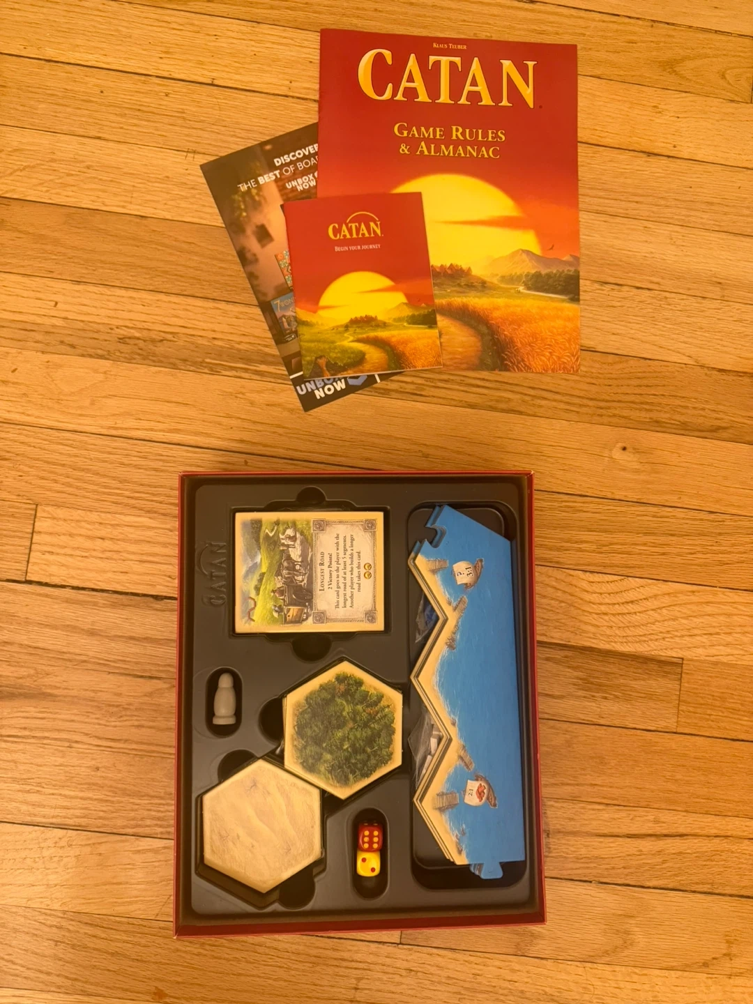This is the classic Catan board game. It includes all the game pieces, rules, and almanac. It's a great game for family game nights!