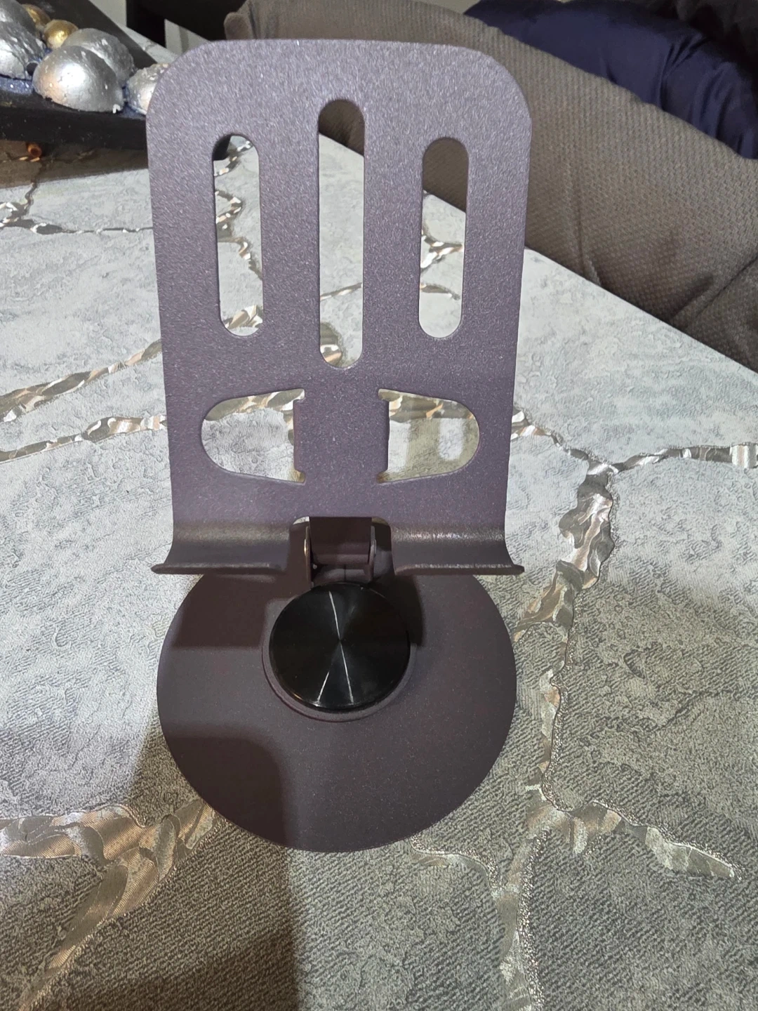 This is a dark grey metal cell phone stand. It features a foldable design with an adjustable base for different viewing angles. Its sturdy construction supports most smartphones.