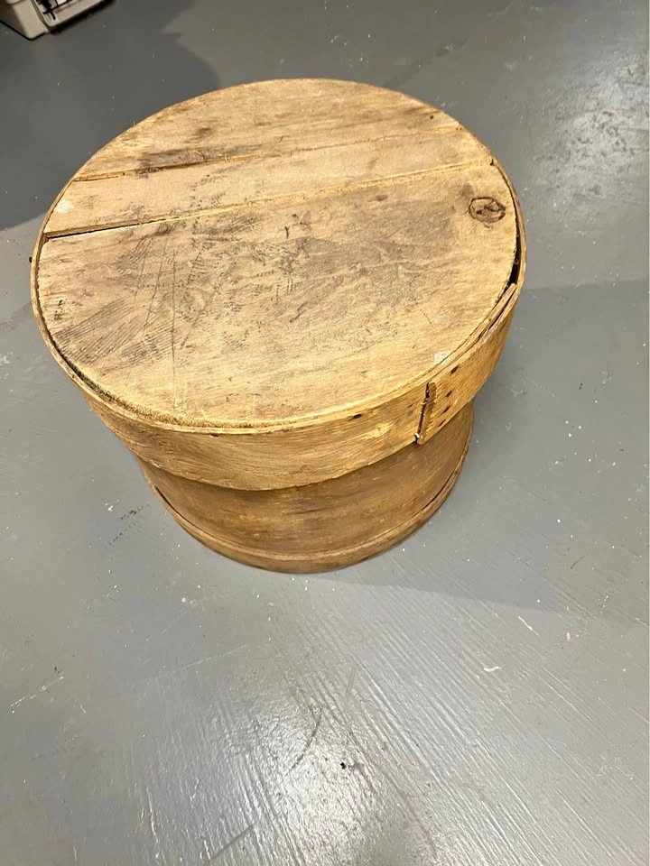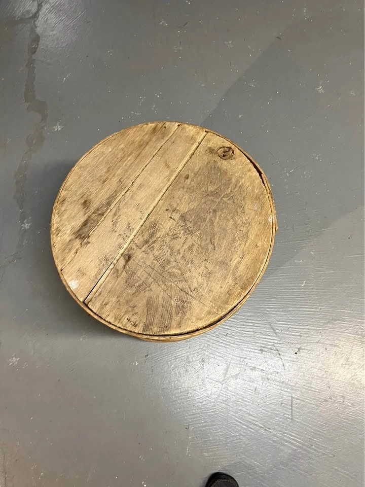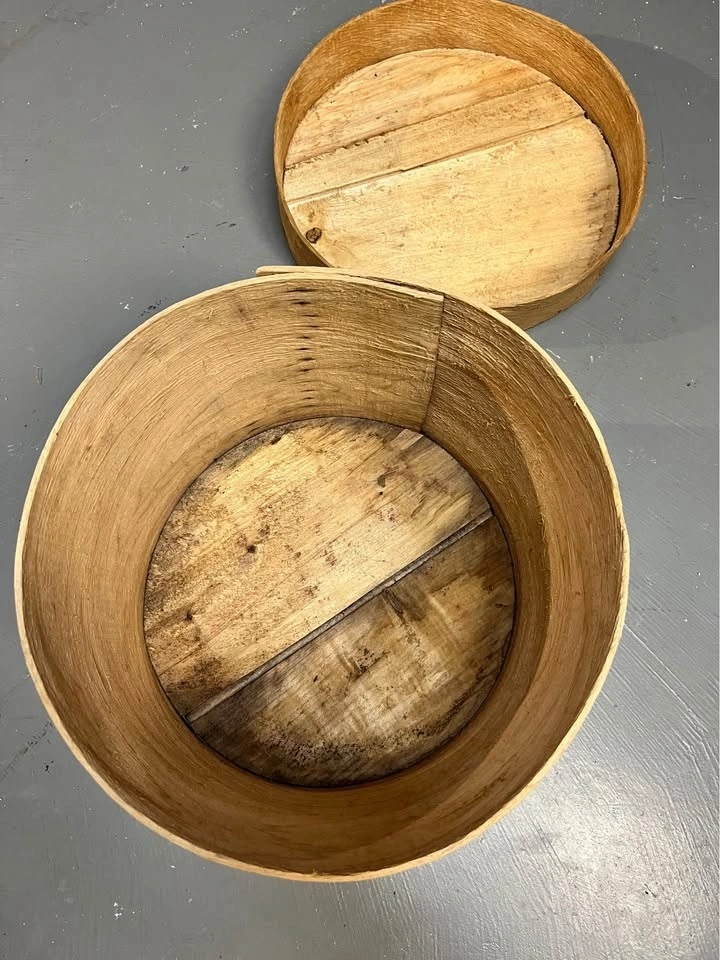 This vintage wooden cheese box is a collectible, round bentwood container traditionally used for storing, aging, or transporting wheels of cheese. Construction: Typically made of bent wood with a circular lid. Usage: Often used as rustic farmhouse decor or for storing items like hats, sewing supplies, ottomans, props, or decor. Pick up and cash only.