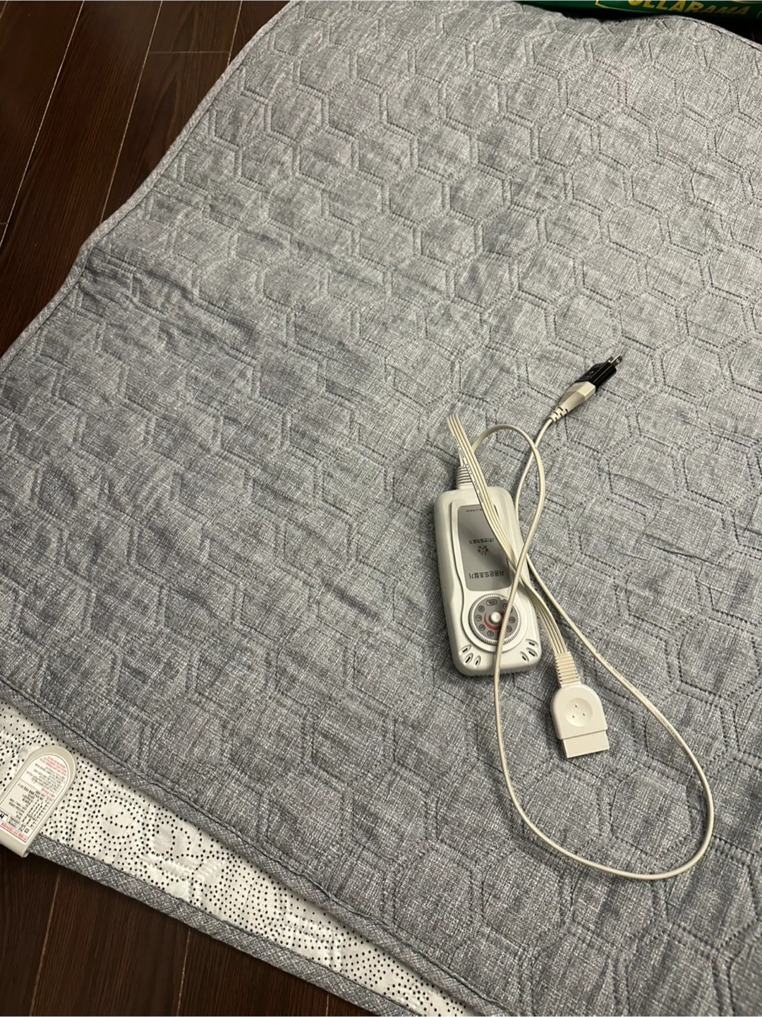 This is a grey electric warming mat with a hexagonal quilted pattern. It includes a controller for temperature adjustment. The mat is for single bed. It's made of a soft fabric material for comfort. This mat could be useful for providing gentle warmth during colder months.