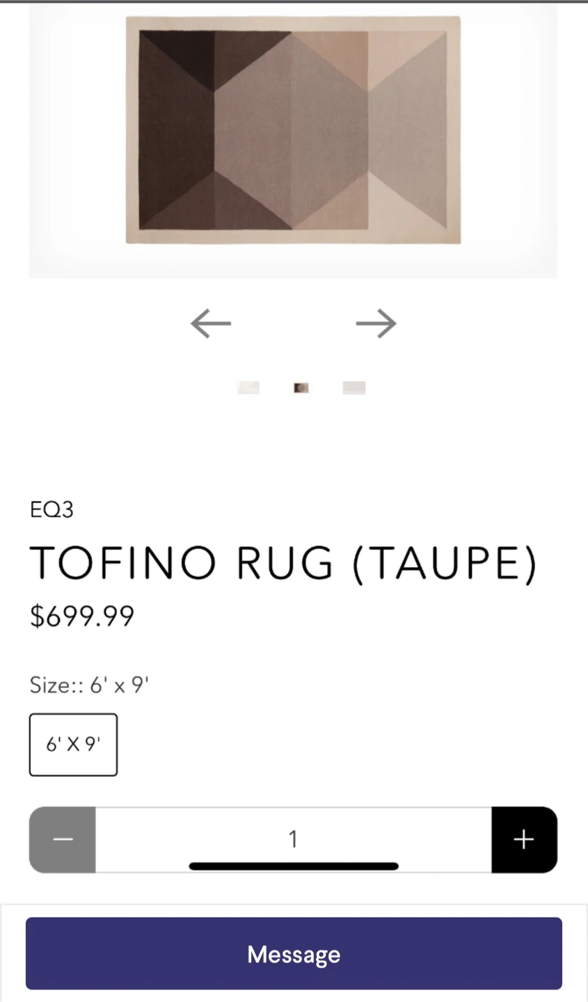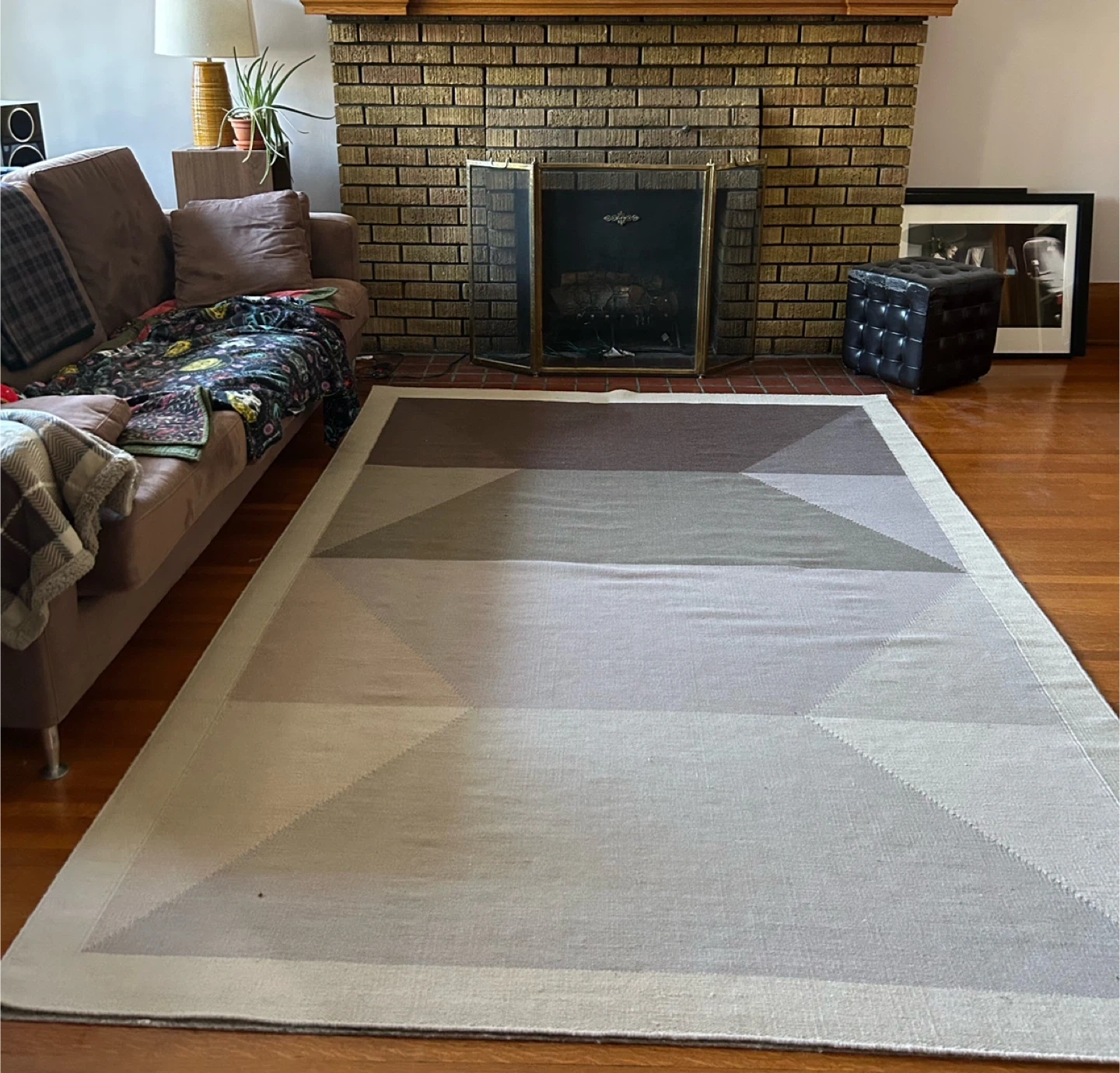 6’x9’ area rug - shades of purple, grey, cream. 100% Indian wool rug. “Tofino” is the model name. Description is that it is a “handwoven dhurrie rug made on the punjab loom”.