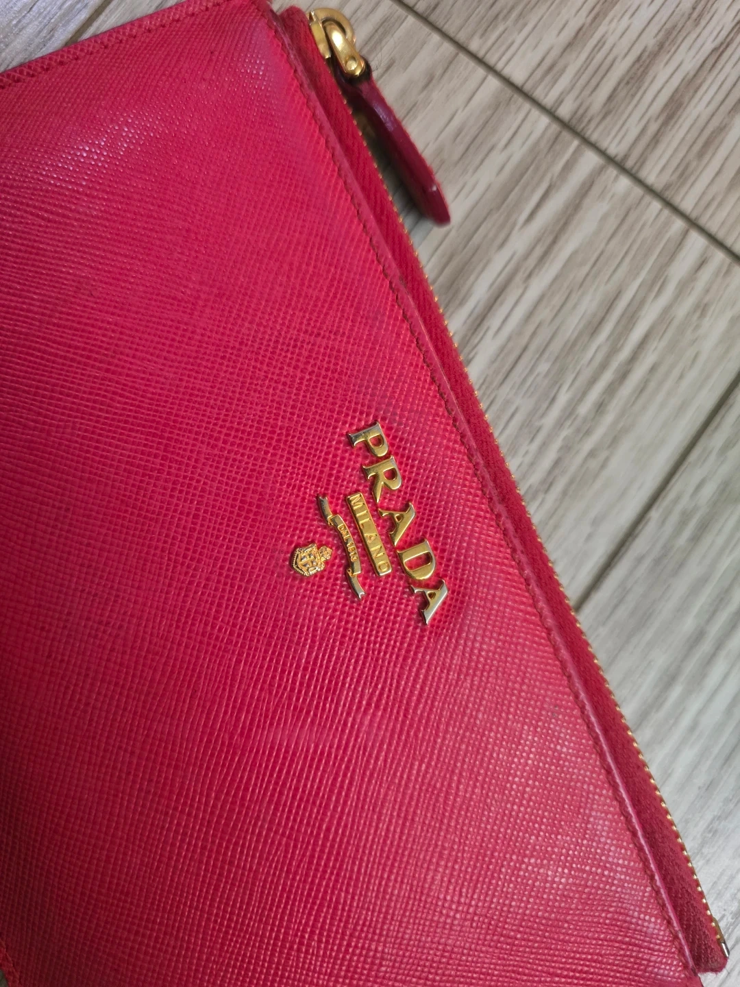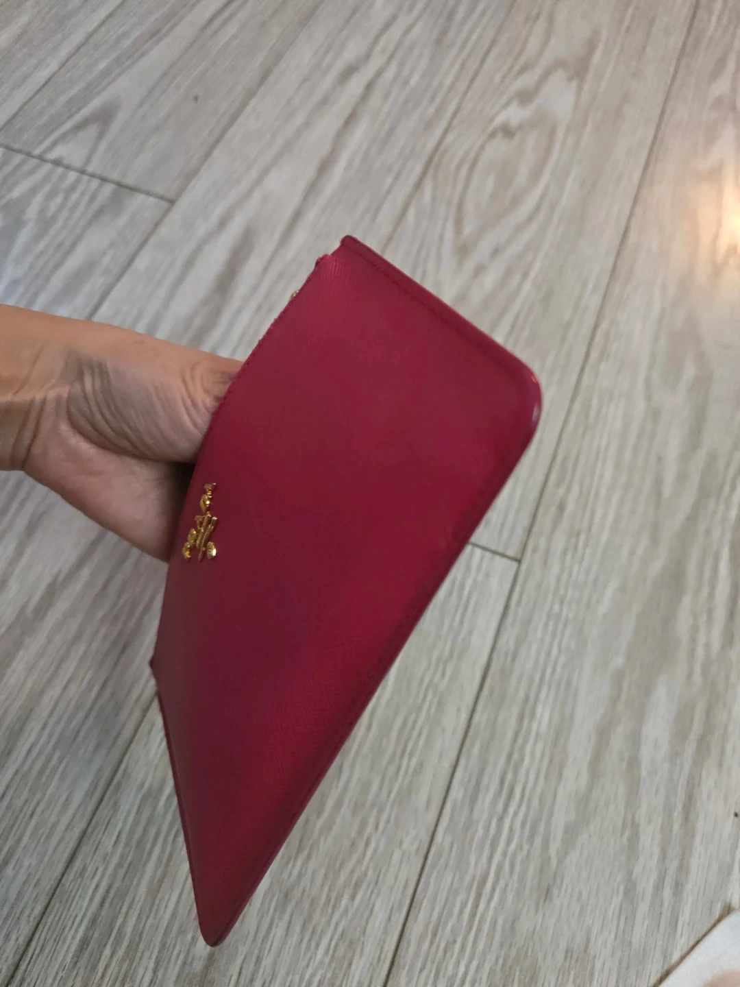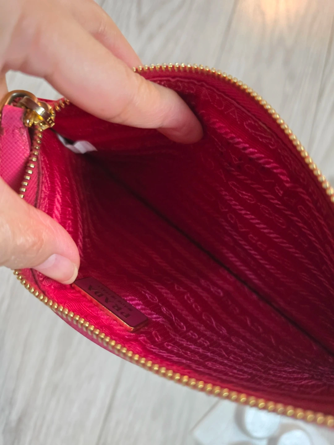 Authentic vibrant pink Prada pouch. Can fit bills. It's made from saffiano leather with gold-tone hardware. This pouch is great for cash and cards and small essentials.