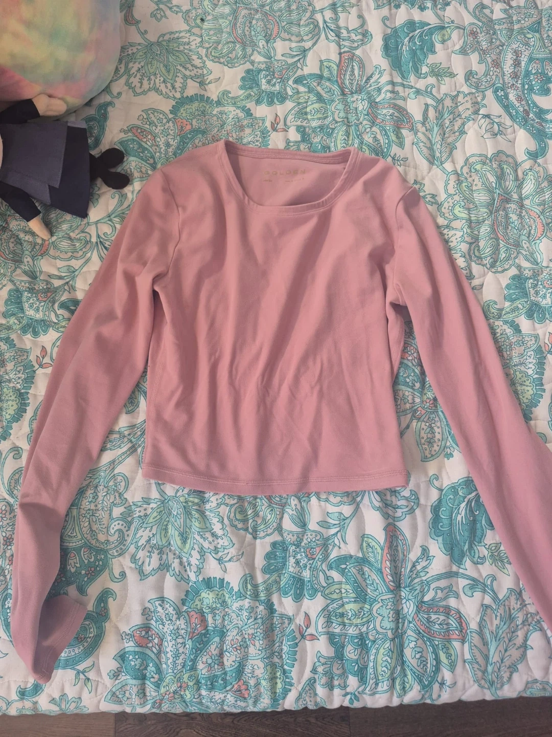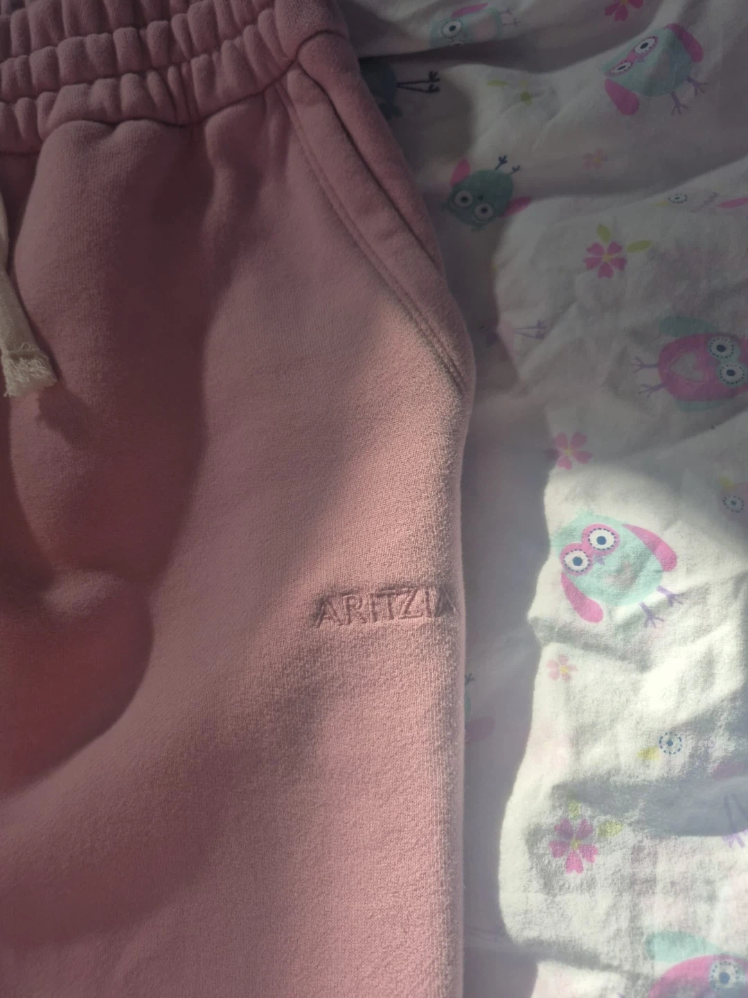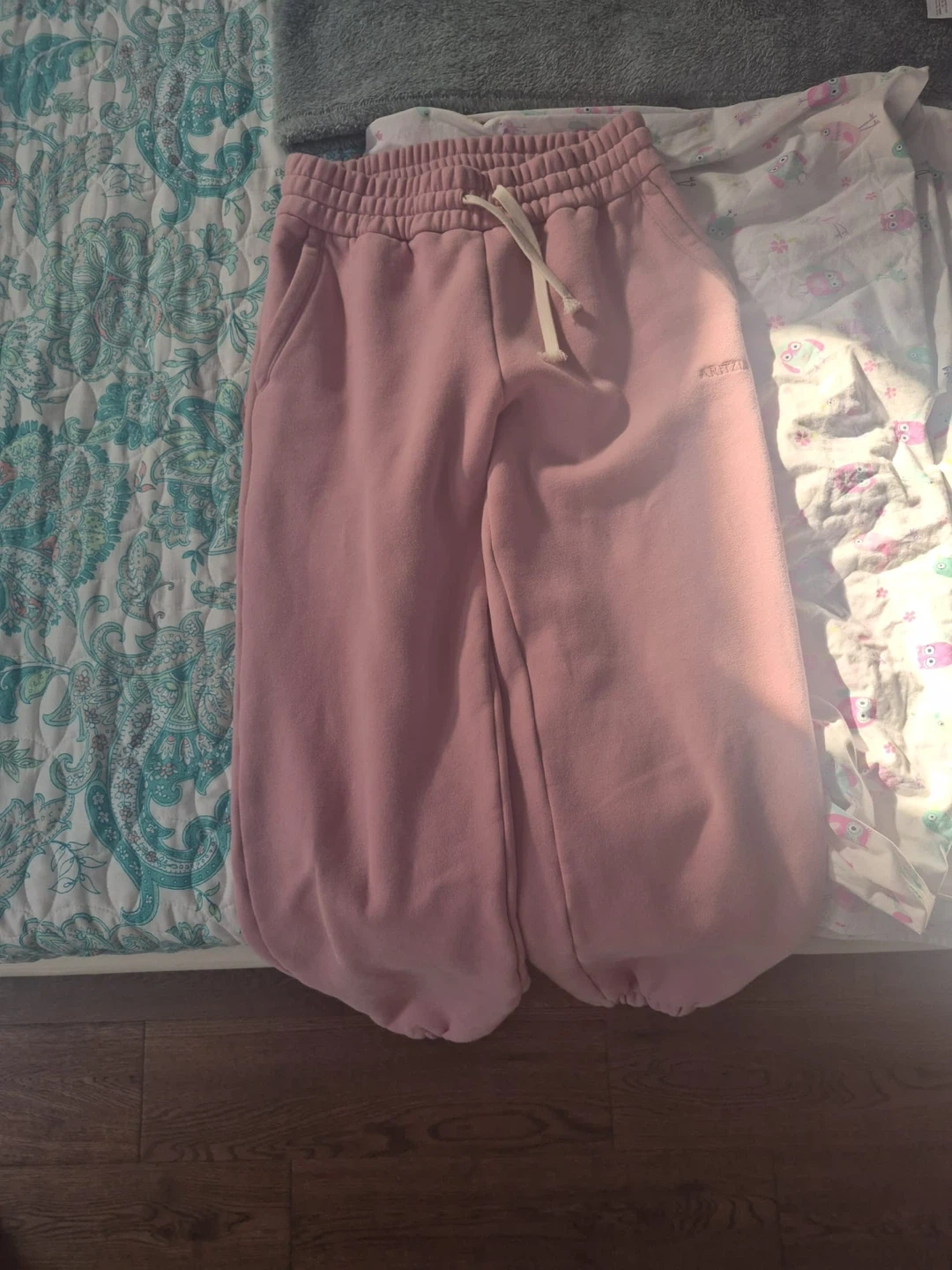This is an Aritzia pink sweatfleece cozy fleece sweatpants set. The sweatpants are a size XS and the long sleeve top is a size S. Both are made of a soft, comfortable material