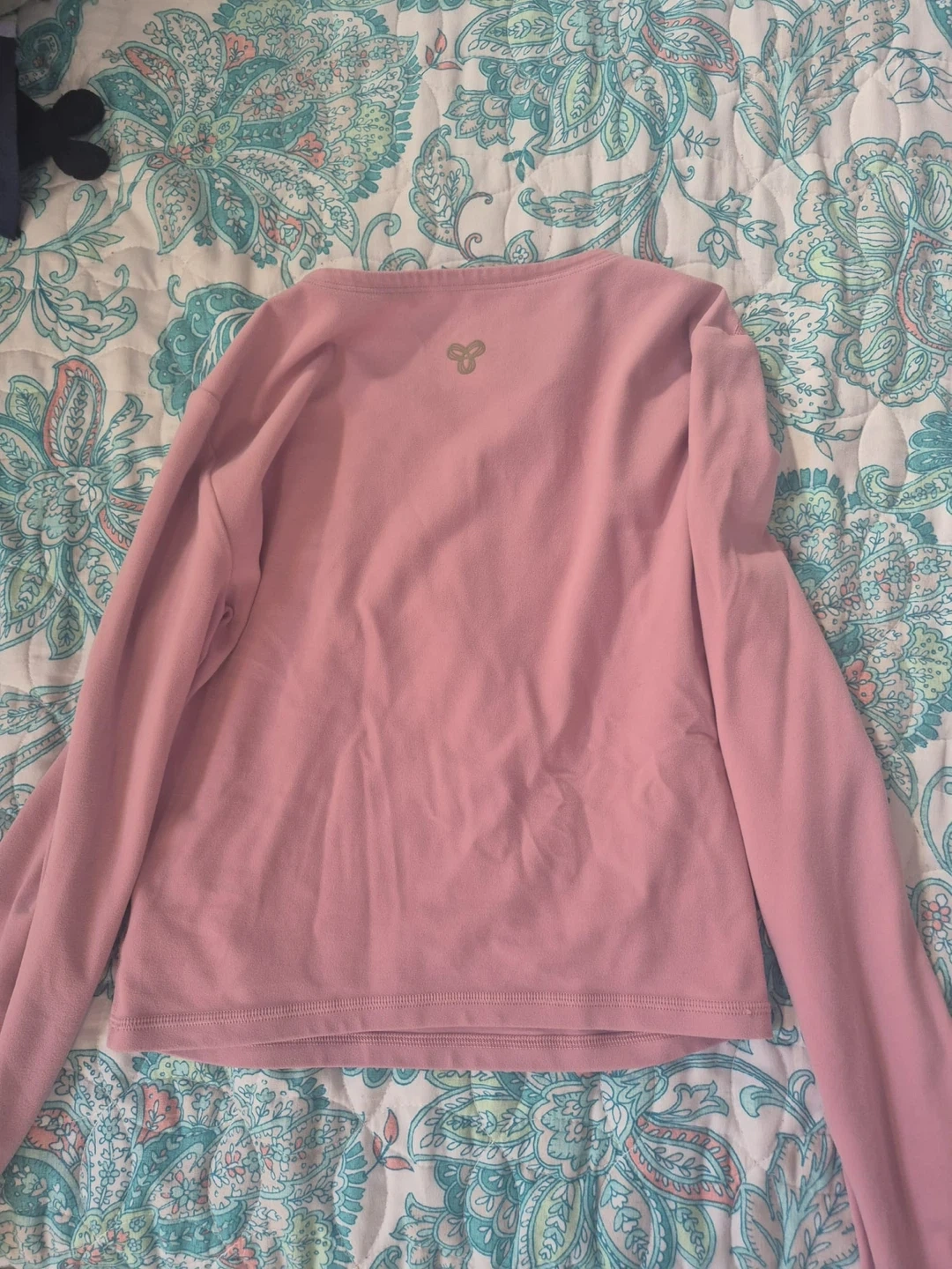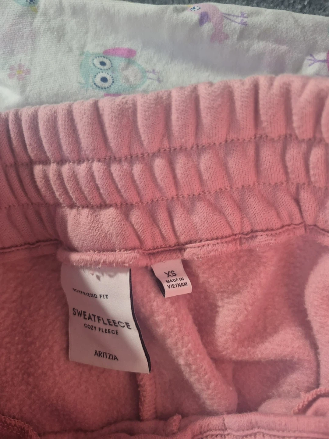 This is an Aritzia pink sweatfleece cozy fleece sweatpants set. The sweatpants are a size XS and the long sleeve top is a size S. Both are made of a soft, comfortable material