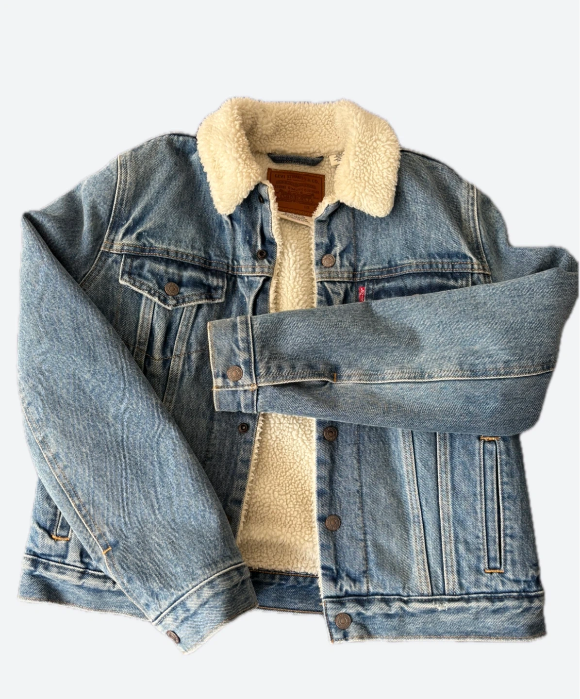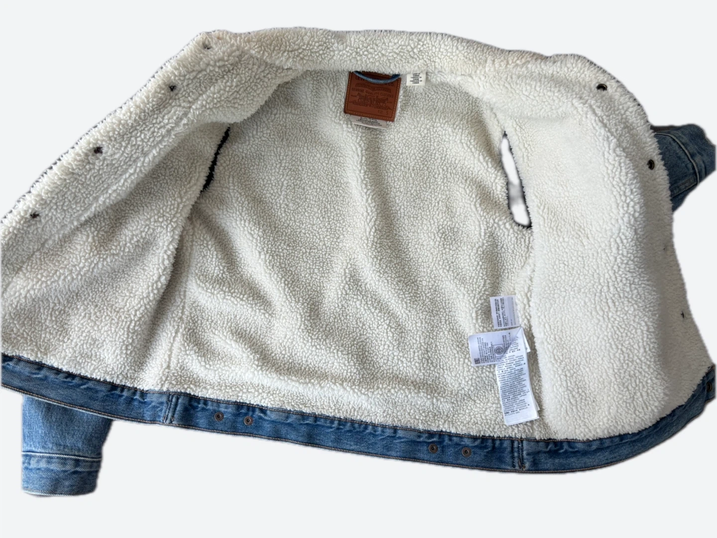 Classic denim jacket lined with cozy sherpa for warmth. Genuine quality clothing from Levi Strauss & Co.
