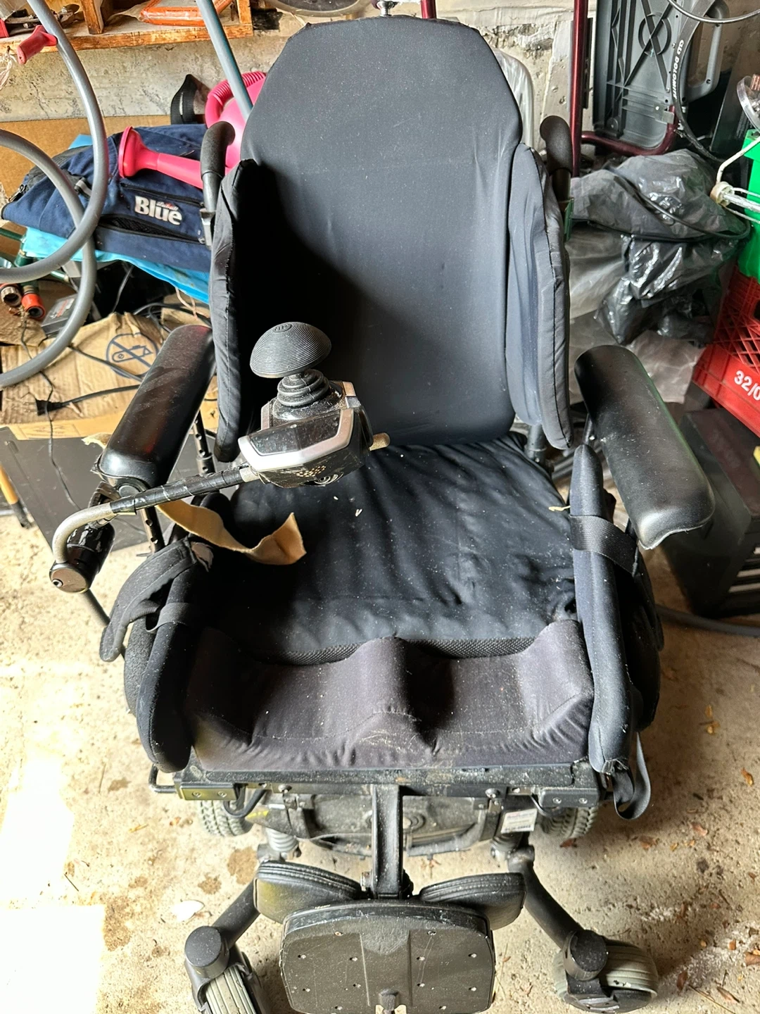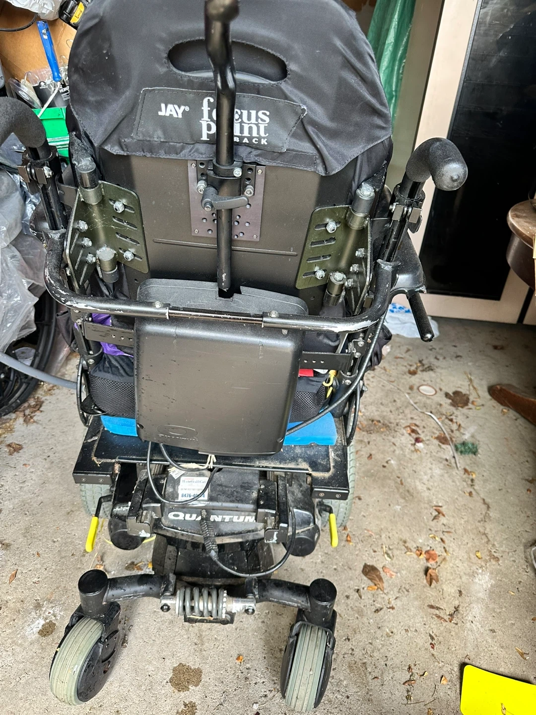 This is a Quantum power wheelchair with a Jay Focus back. It's black and has an adjustable joystick controller. The chair is designed for mobility assistance.