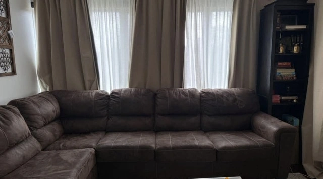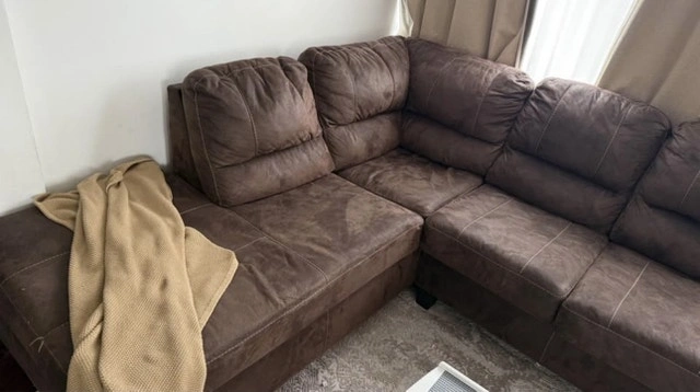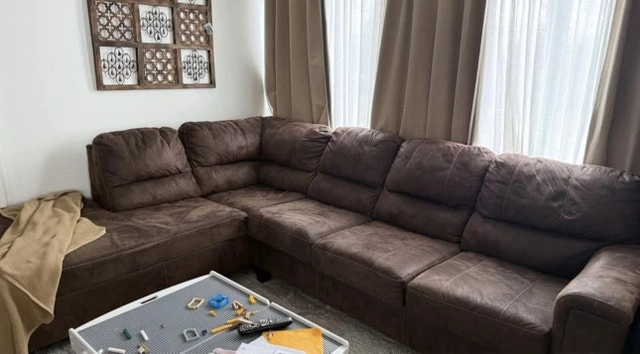 Bought it from Ashley's for $2400 - very good, like-new condition. If you love the idea of a luxe look that won't break the bank, make yourself comfortable with the alluring walnut brown Maderla sectional. Designed to look like the real thing, it's wrapped in a practical faux leather loaded with natural tonal variation and a soft hand feel. Appealing to a contemporary taste, its jumbo stitching, tufted styling and pillow top armrests are indulgently comfortable, with a streamlined look that tops off the high-end aesthetic made for everyday living.