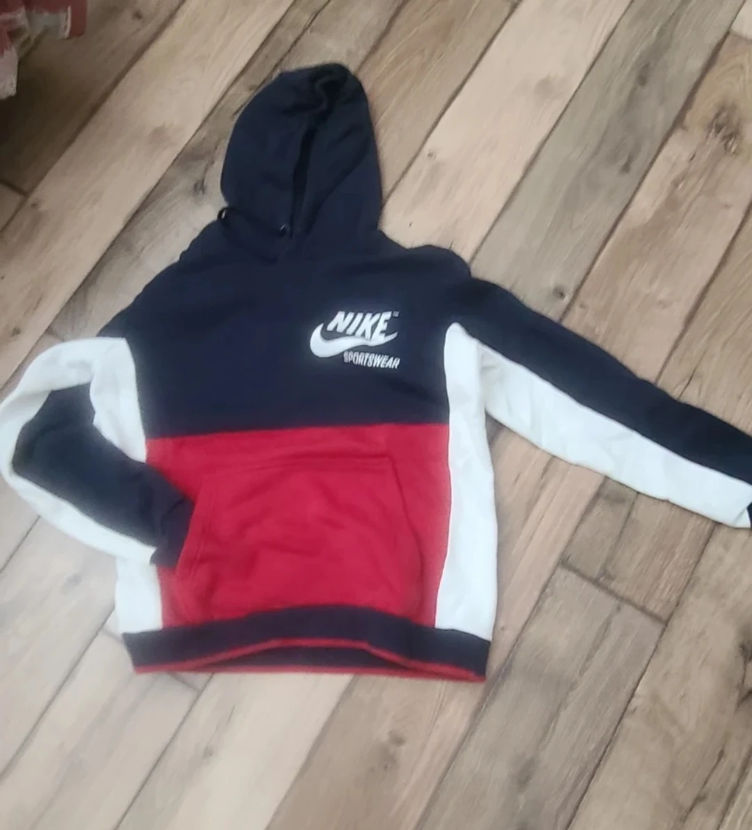 This Nike Sportswear hoodie features a navy, red, and white colour block design. It's made with a soft fleece-like material. A kangaroo pocket is at the front.