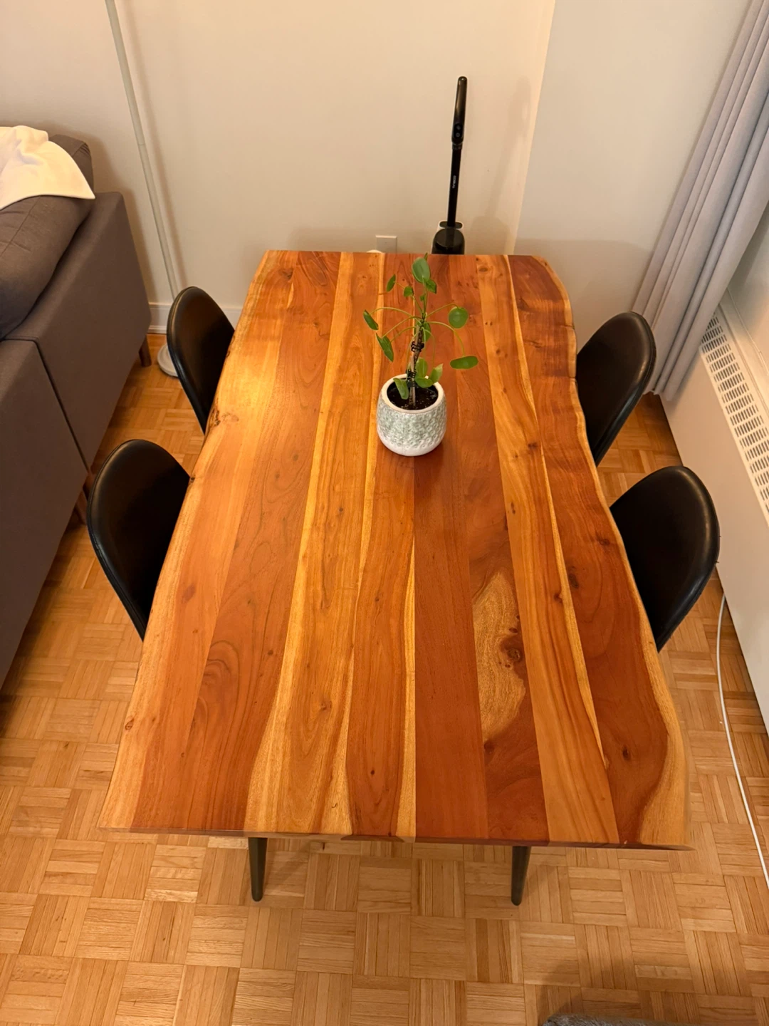 This dining table features a natural live edge wood top and sturdy metal legs. It comfortably seats four chairs. Perfect for bringing a rustic modern touch to your dining space! (chairs are not included)