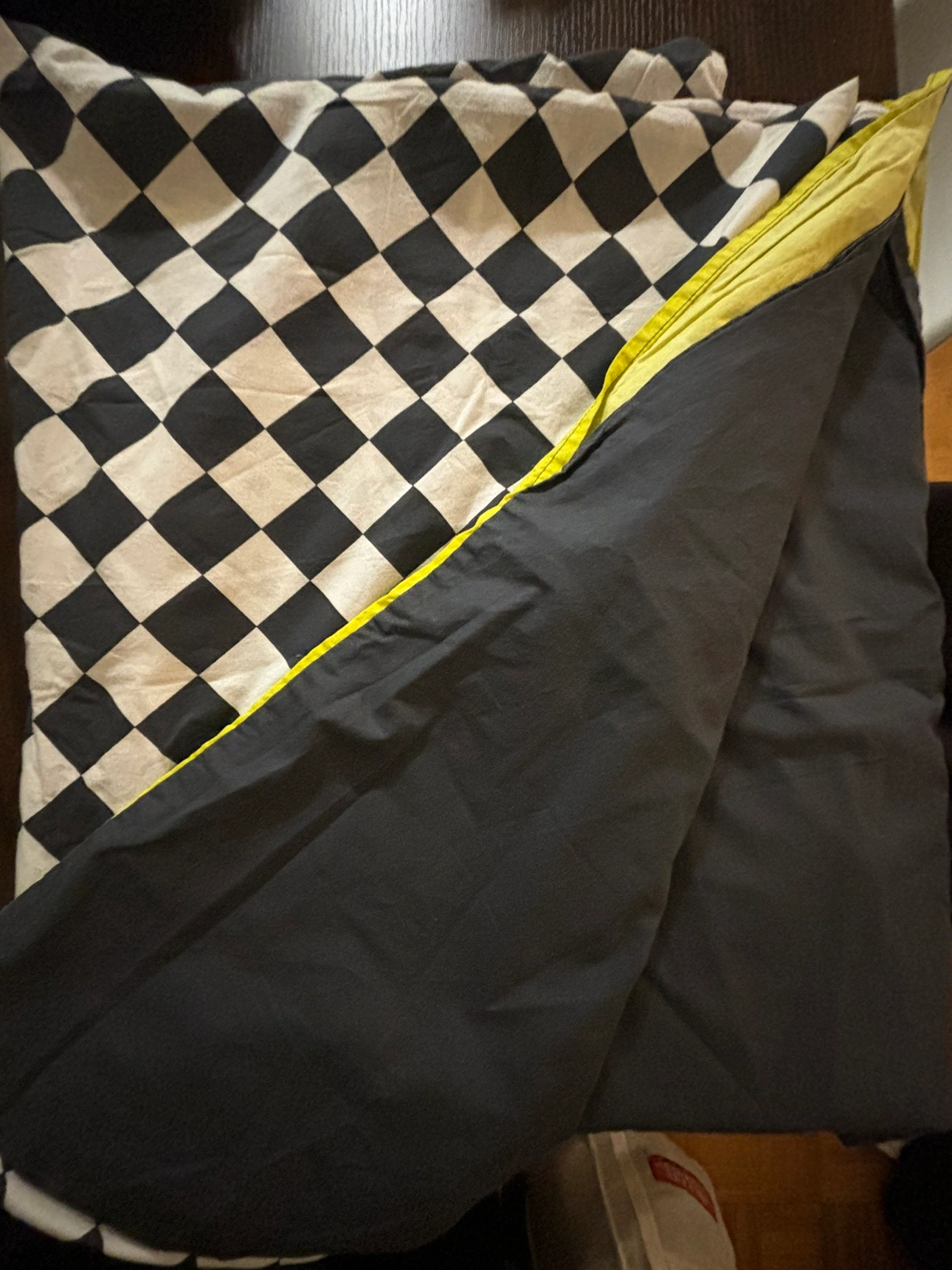 The duvet cover is black with a white and yellow design. The reverse side is a black and white checkered design. The cover is reversible.