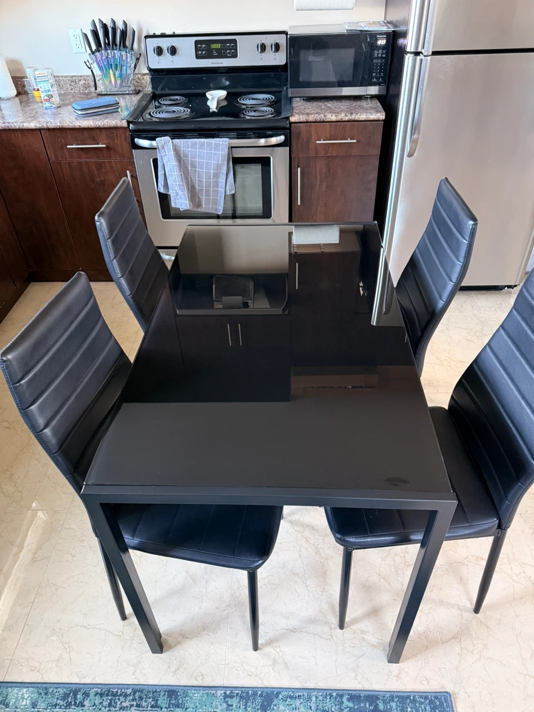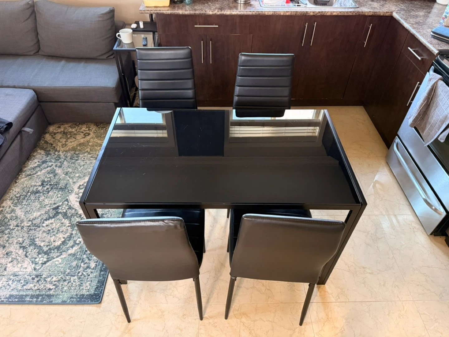 Four black dining chairs with a modern design. These chairs are upholstered in a faux leather material and feature a sleek, ribbed backrest. They're sturdy and comfortable, perfect for your dining area!