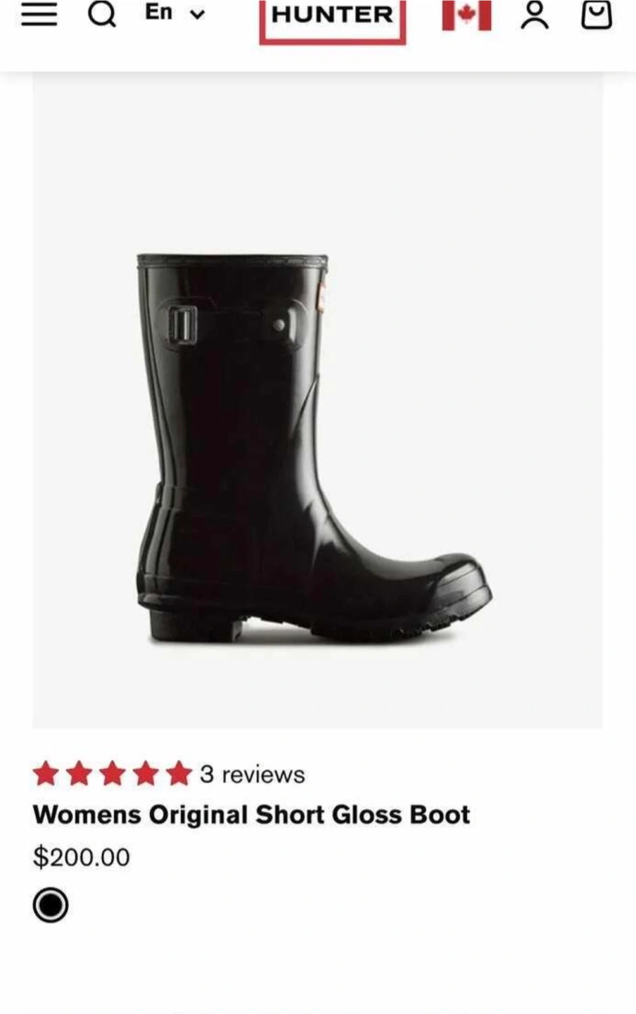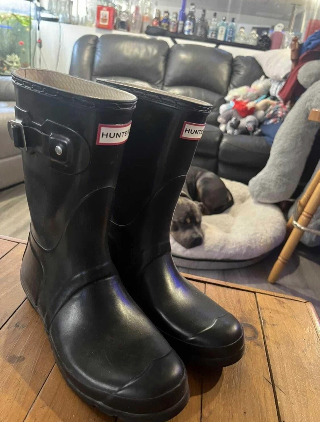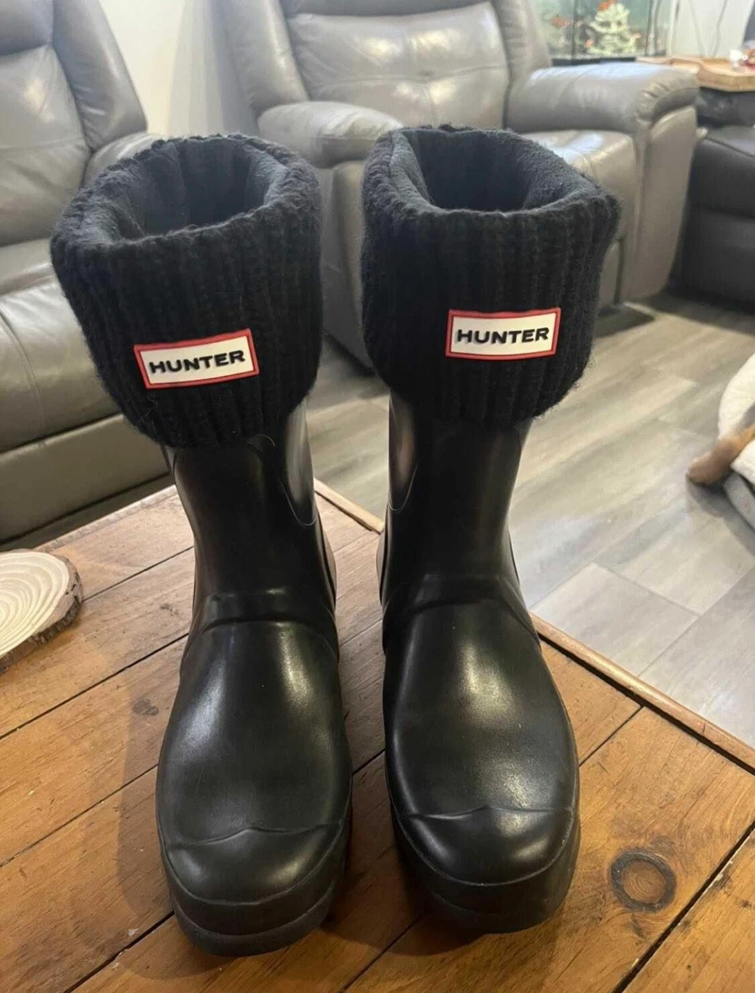 Selling a pair of Hunter Original Short Gloss black boots. Includes Hunter Black 6 Stitch Cable Cuff Tall Boot Socks. Boots are waterproof and made for outdoor wear. Over $250 for these new with socks.