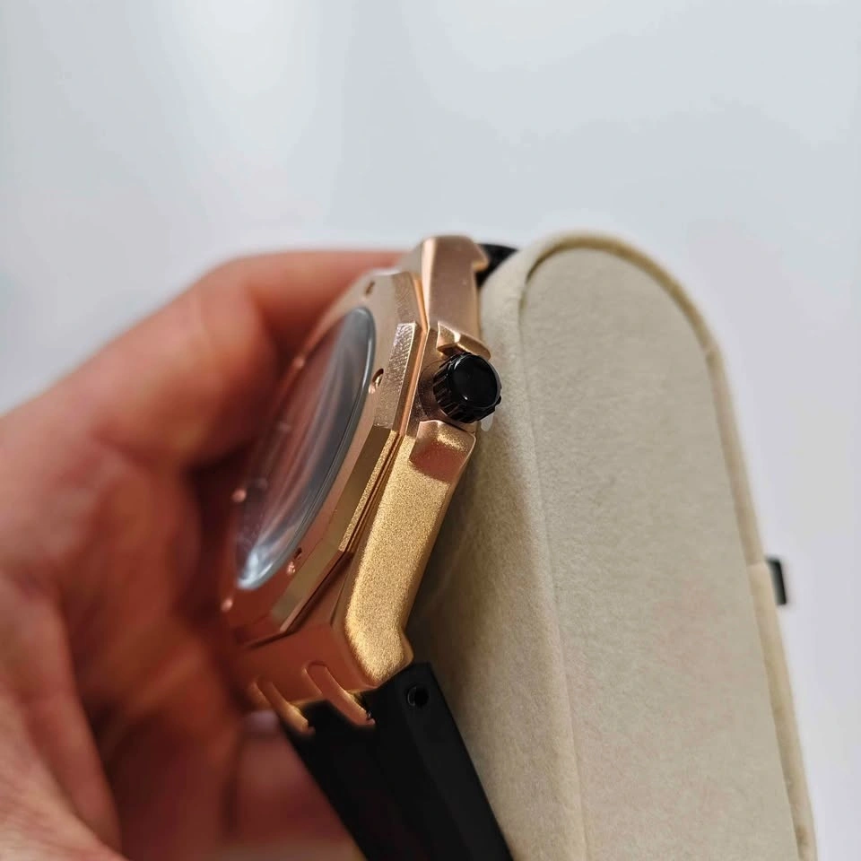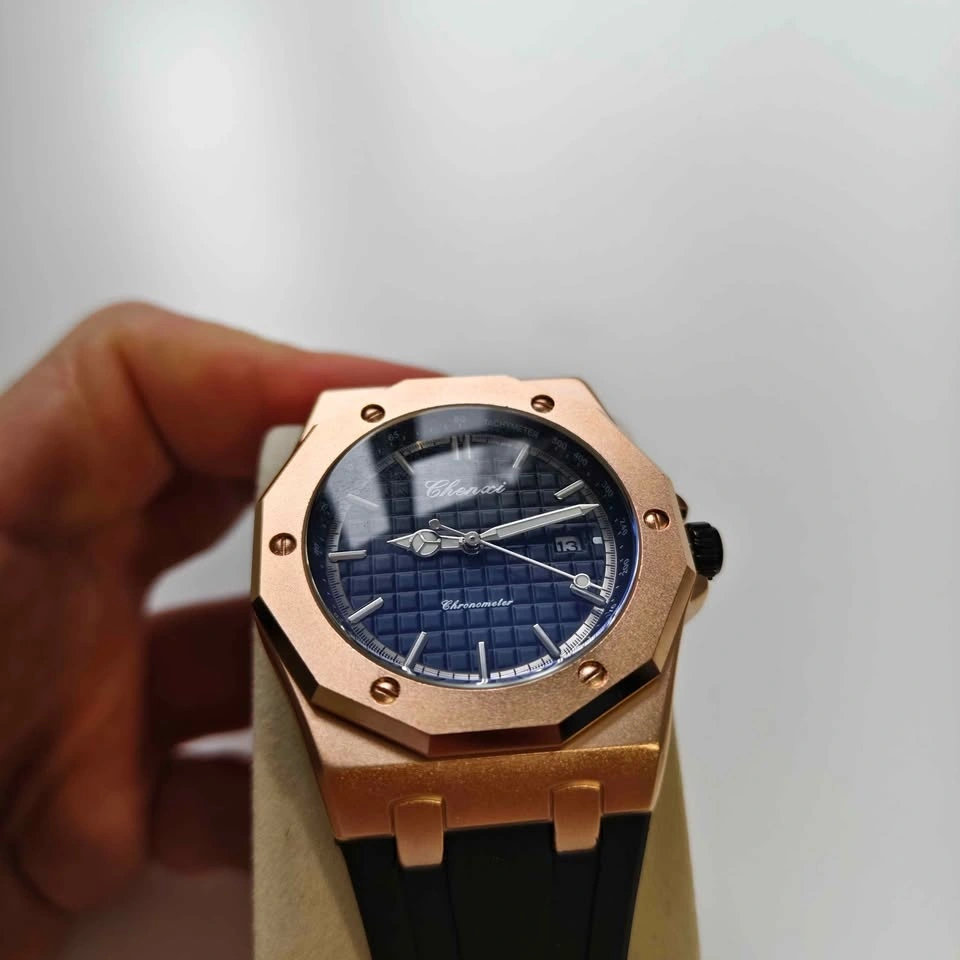 If you love the look of high-end luxury sport watches, this stunning octagonal rose gold mens wristwatch is guaranteed to turn heads! The deep navy blue textured dial, screw-down bezel detail and premium black rubber silicone strap give it that iconic luxury dress sport watch look at a fraction of the price!