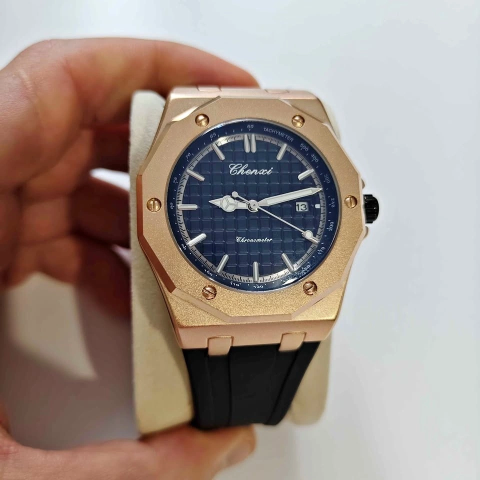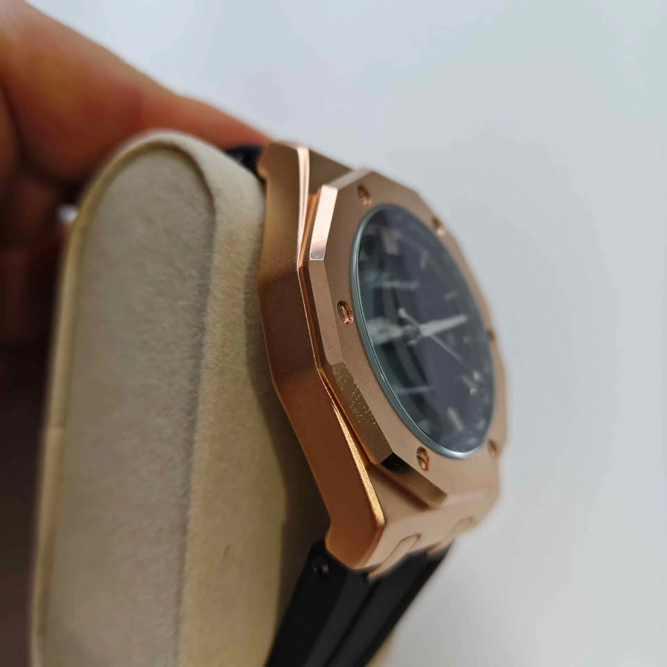 If you love the look of high-end luxury sport watches, this stunning octagonal rose gold mens wristwatch is guaranteed to turn heads! The deep navy blue textured dial, screw-down bezel detail and premium black rubber silicone strap give it that iconic luxury dress sport watch look at a fraction of the price!