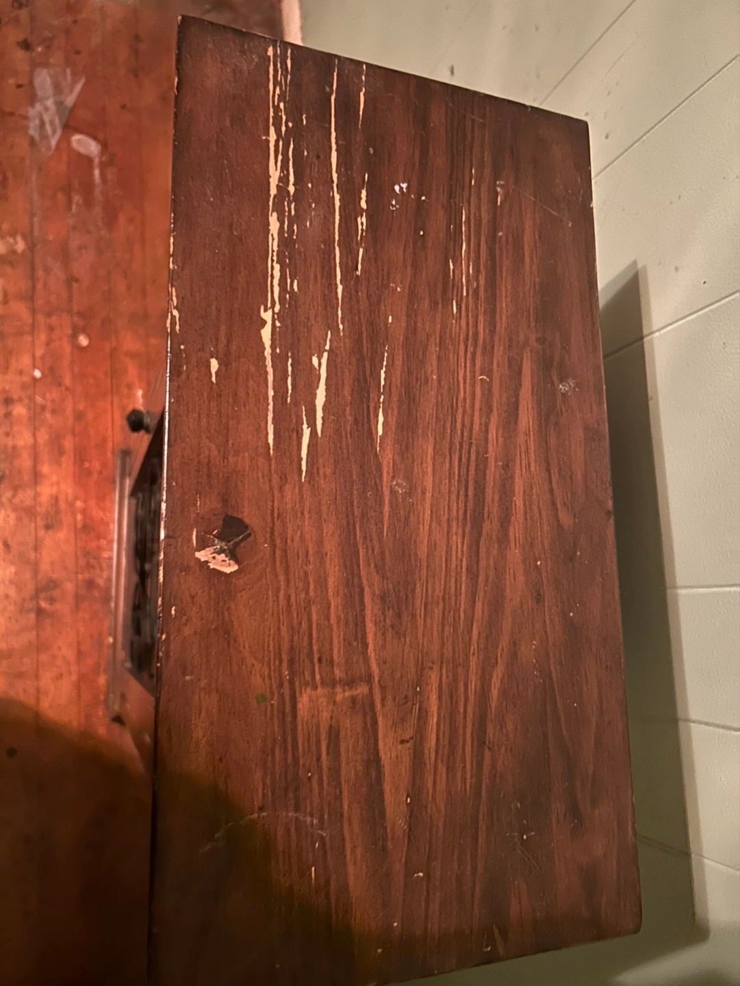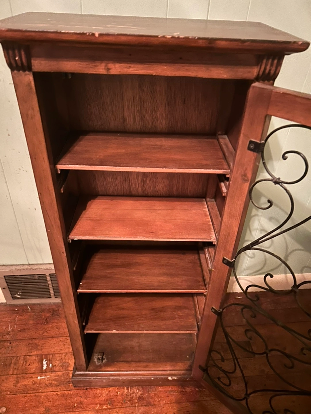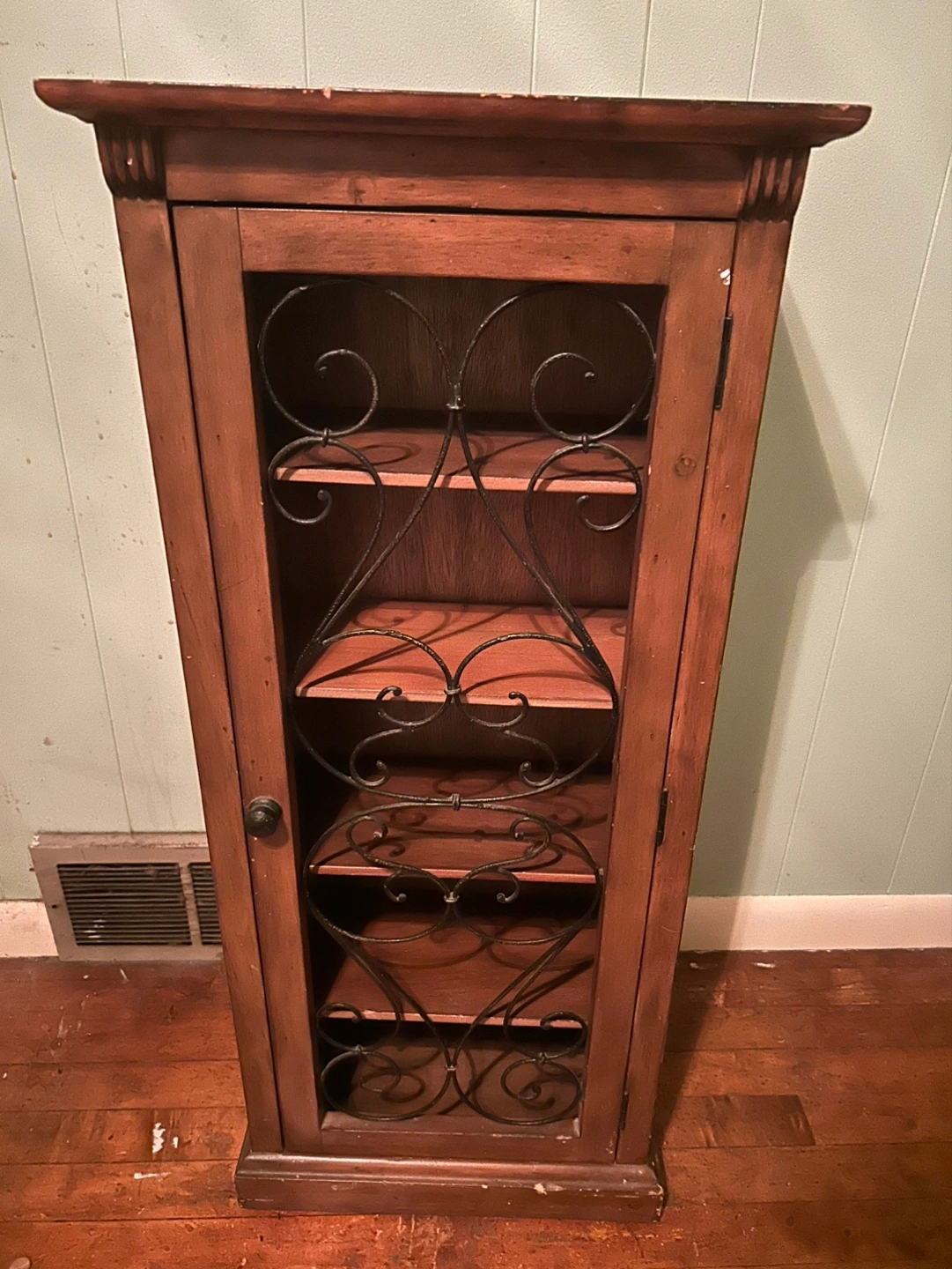 Small wooden cabinet, multiple shelves. Glass door with metal detailing. Some paint scratches on top. Can use for cd’s, dvd’s, Knick knacks etc or repurpose for something else