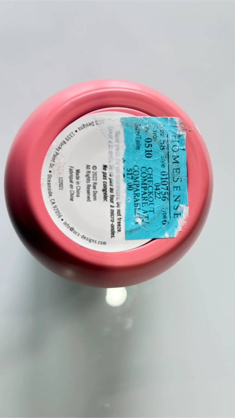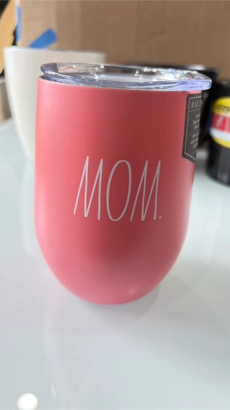 This Rae Dunn tumbler features the word "MOM" in white script. It's made of stainless steel and comes with a clear plastic lid. Great for keeping drinks hot or cold!