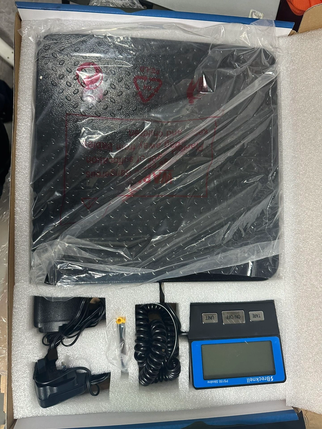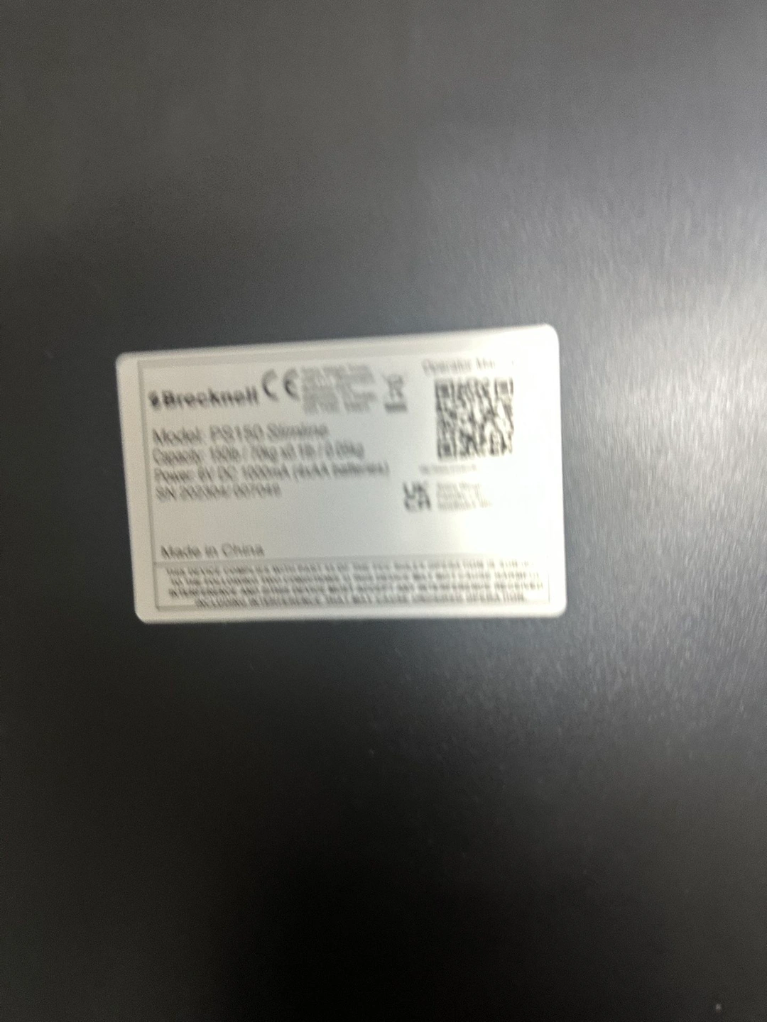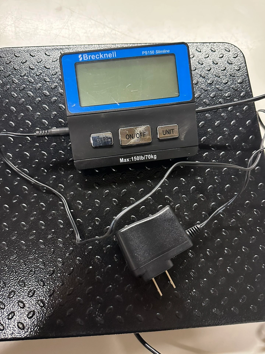 Black Brecknell digital scale with LCD display. Great for general use, mail rooms, shipping/receiving, and warehouses. Battery operated. Supports up to 150 lbs.