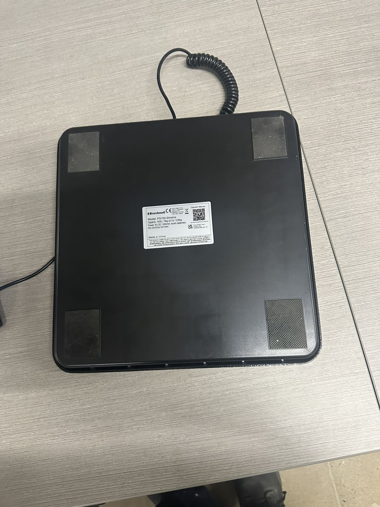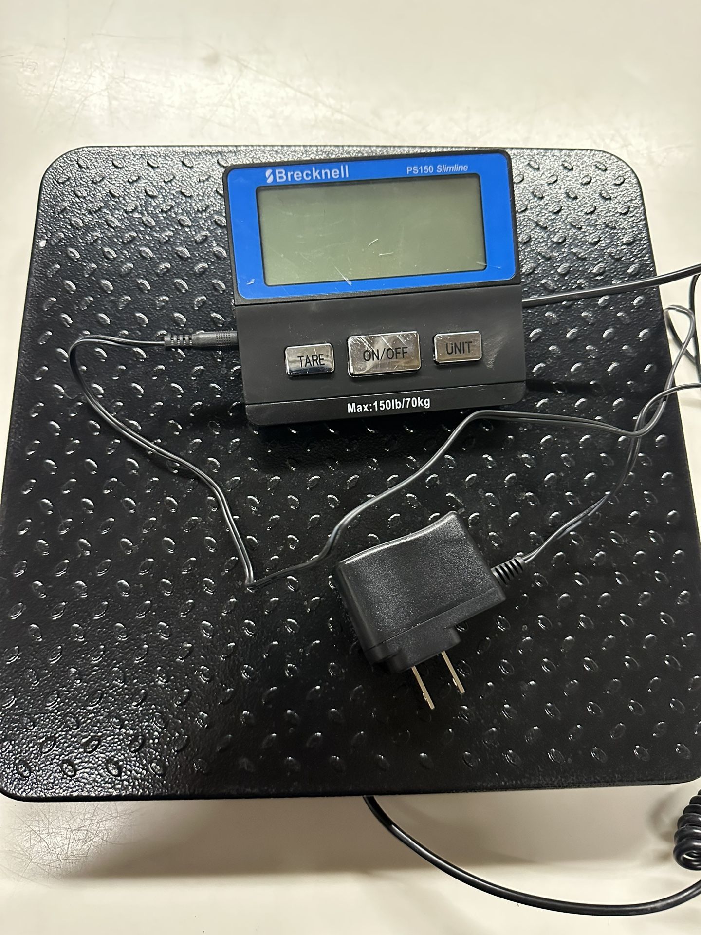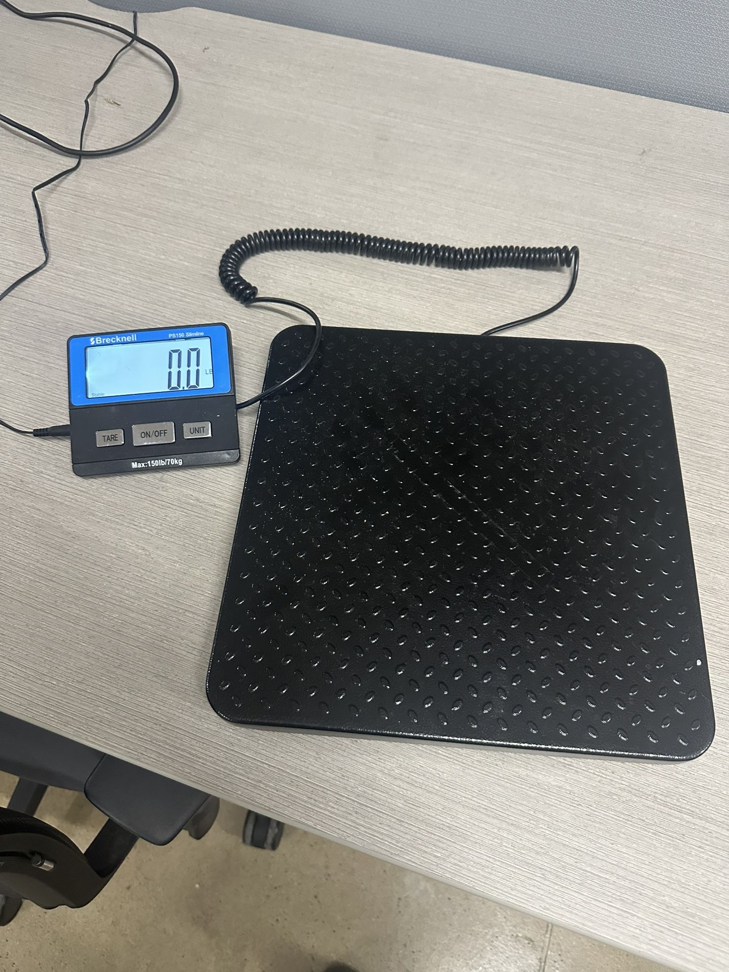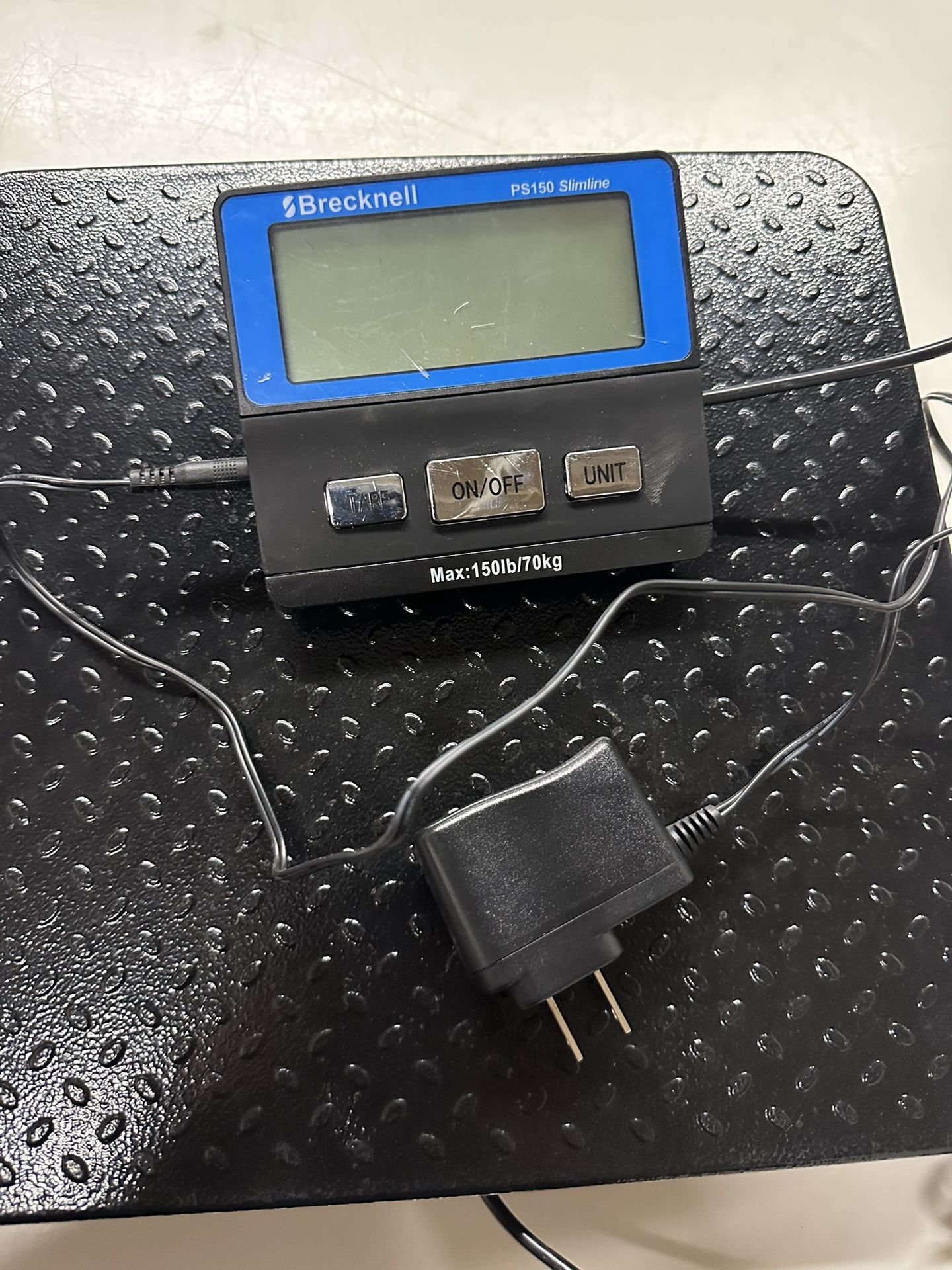 Black Brecknell digital scale with LCD display. Great for general use, mail rooms, shipping/receiving, and warehouses. Battery operated. Supports up to 150 lbs.