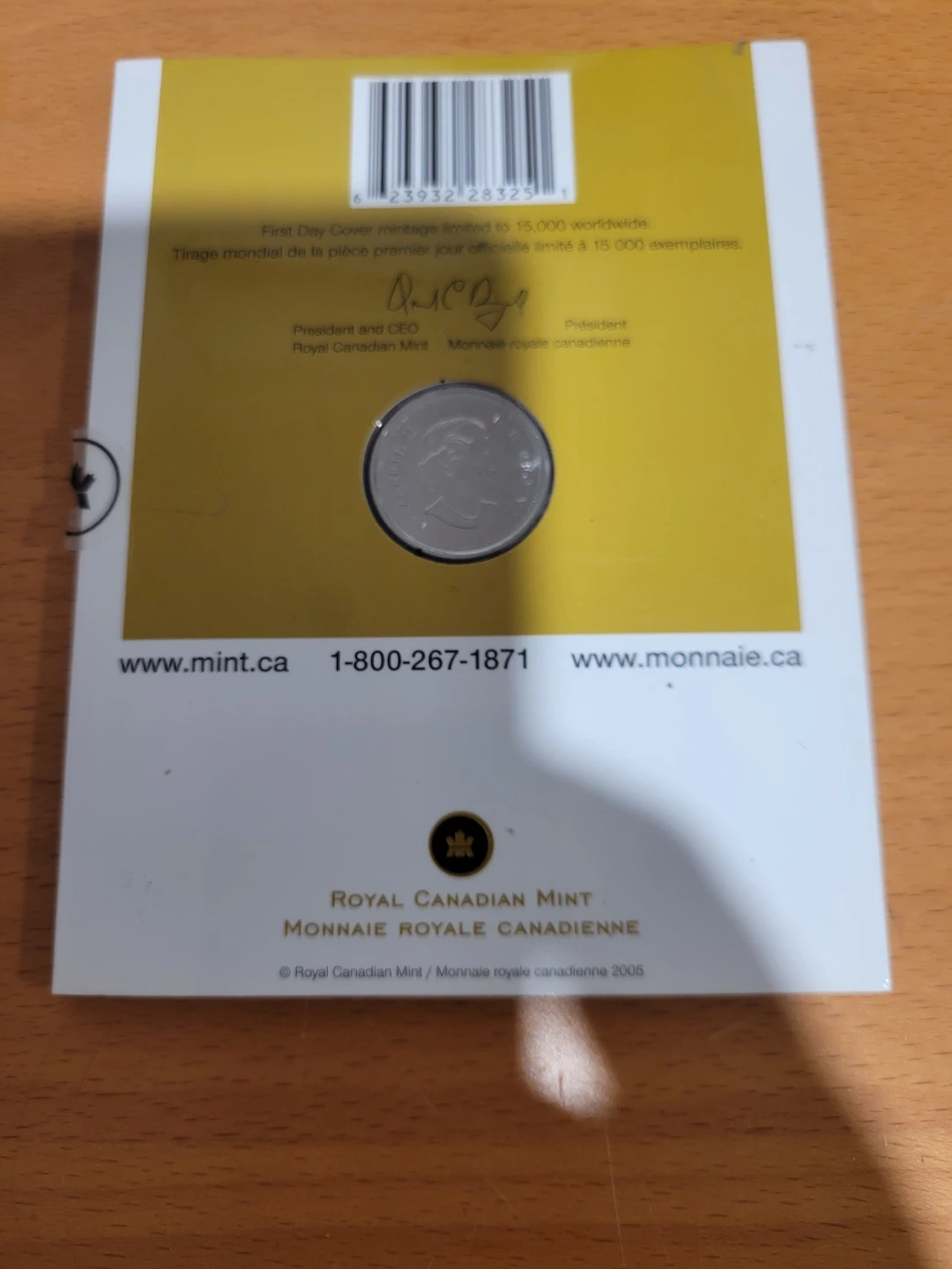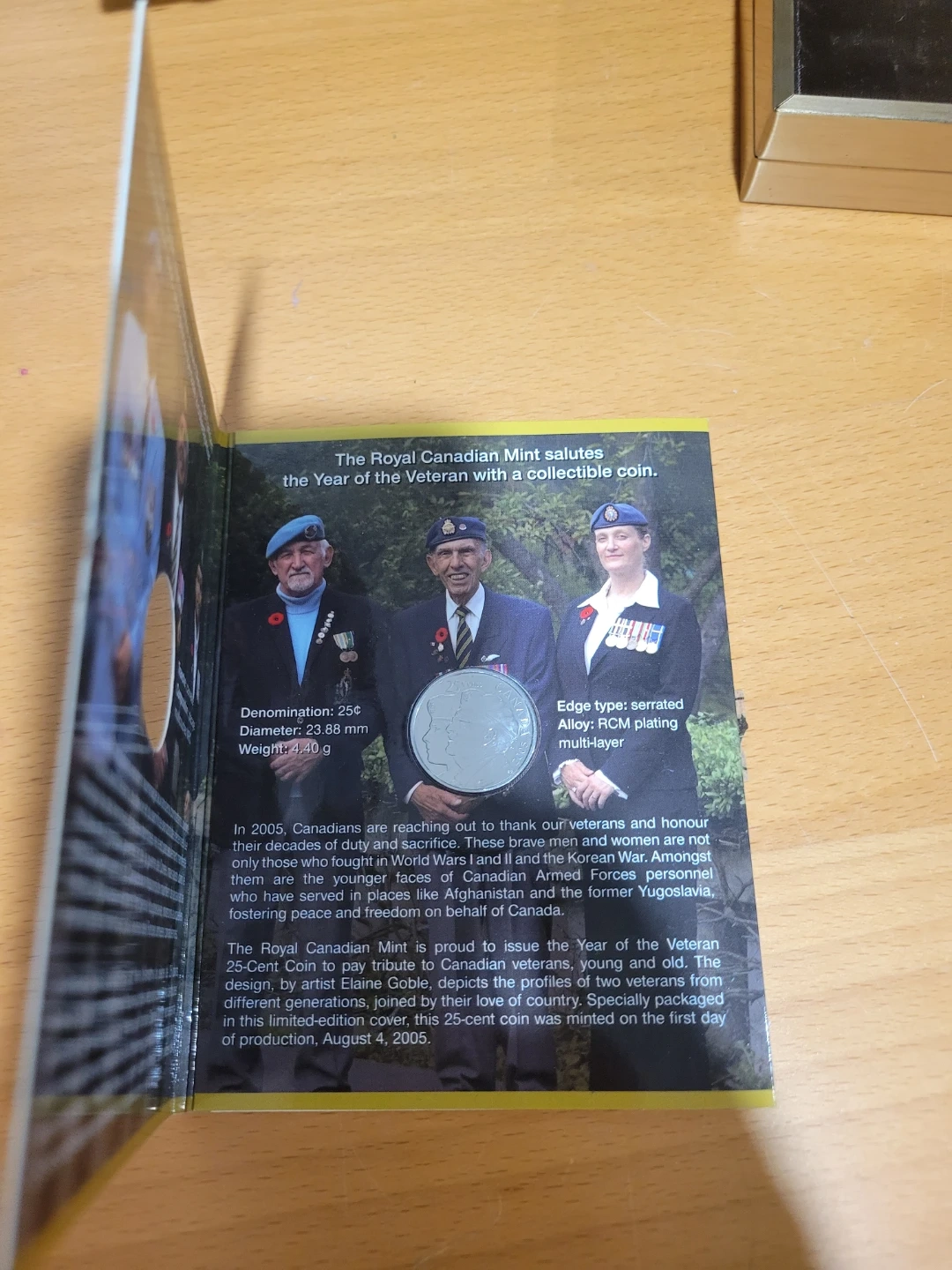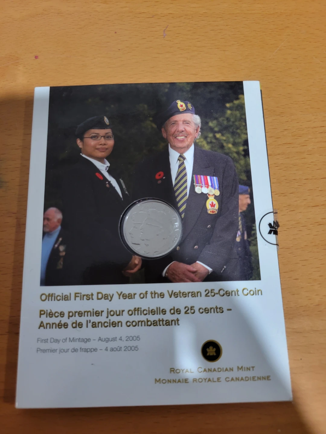 This is the official First Day Year of the Veteran 25-cent coin from the Royal Canadian Mint. It was minted on August 4, 2005. The coin has a diameter of 23.88 mm and weighs 6.27 grams.
