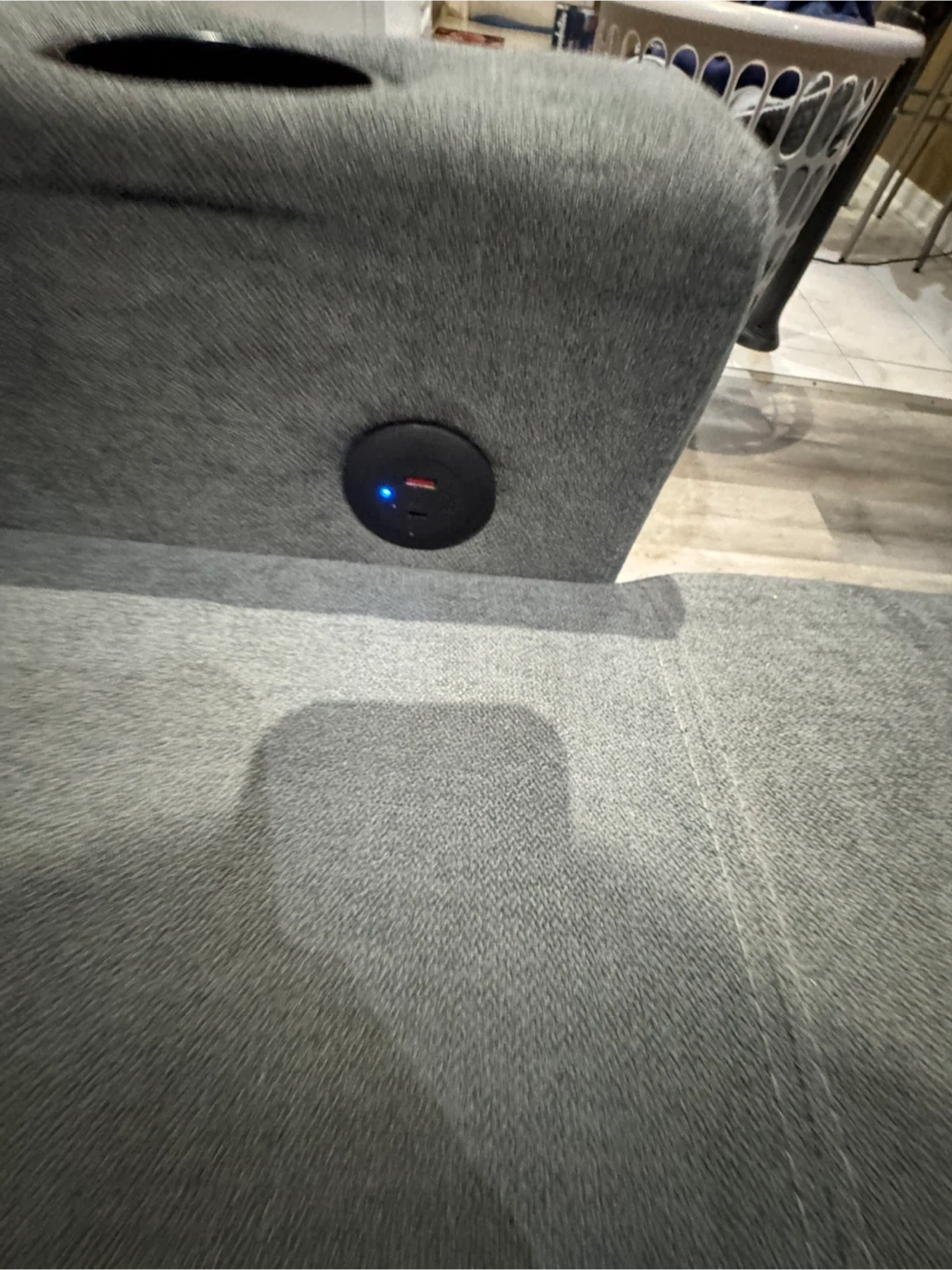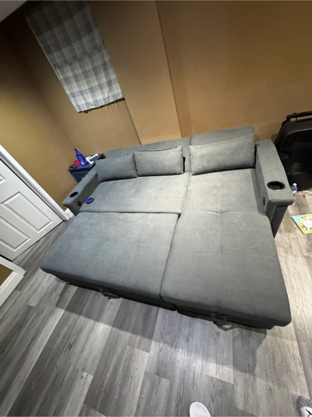 This grey sectional sofa offers convenient pull-out bed functionality and built-in USB charging ports. It's upholstered in a durable fabric and features cup holders on the arms. Storage is available under the chaise. Pick up only