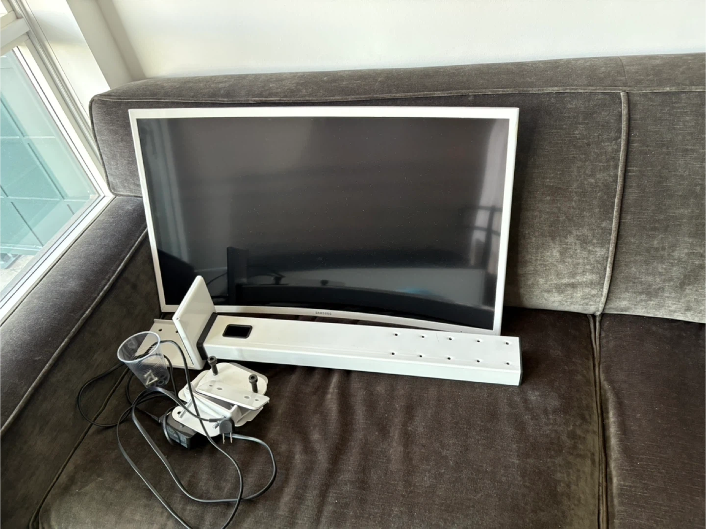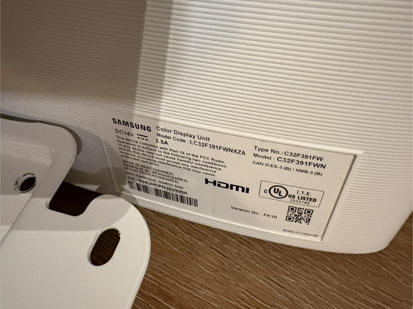 Details:• Brand: Samsung• Model: C32F391FWN• Size: 32 inch curved display• HDMI connection• Includes power adapter and stand/mount pieces• Slim white design