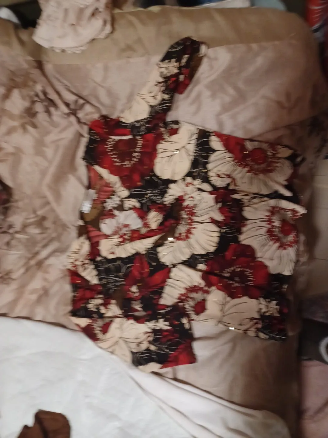 Here's a blouse with a floral print! It has a unique one-shoulder design and could be a great addition to your wardrobe. It features a mix of red, white, and black floral patterns. Feel free to ask if you have any questions!