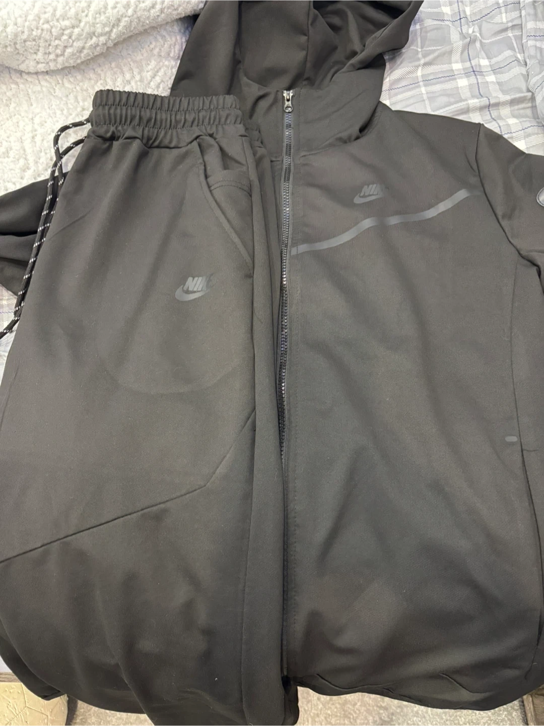Selling a Nike tracksuit in black, size medium. It includes both the jacket and pants. Great for workouts or just lounging around.