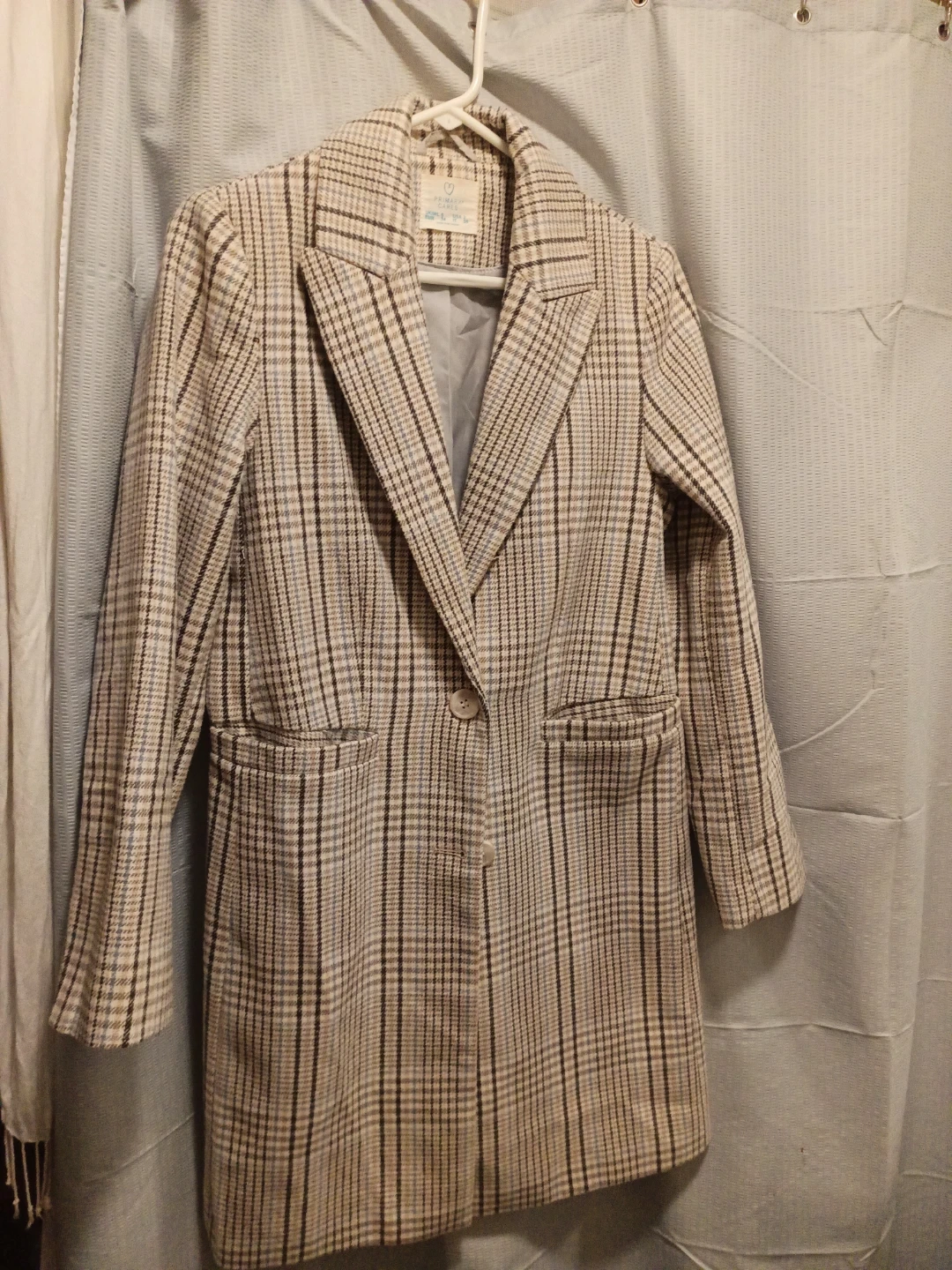 A stylish women's blazer from Primark. It features a classic plaid pattern in neutral tones. This single-button jacket has two front flap pockets and a notched lapel. Perfect for layering over dresses or blouses!