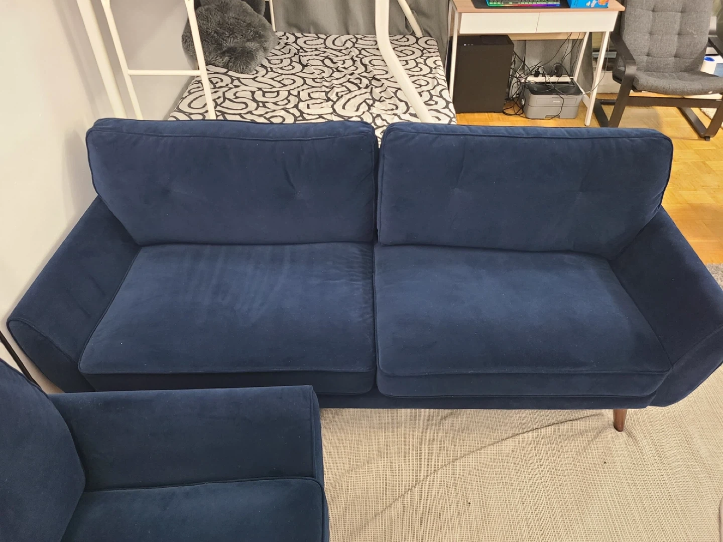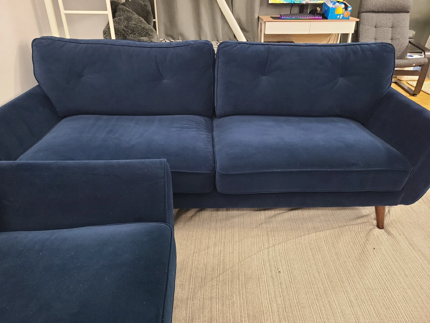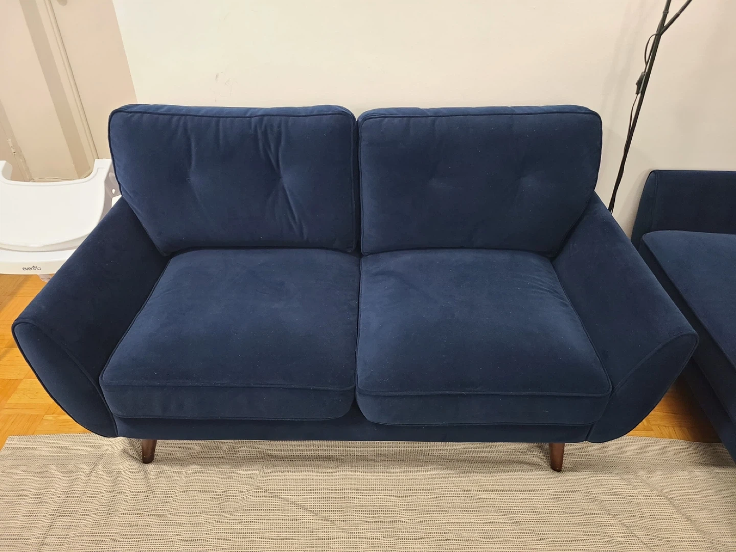 A comfy navy blue two-seater sofa. Its velvet upholstery offers a soft feel. Features button tufting on the back cushions and tapered wooden legs. Bought from Leons’ an year ago. In really good condition. Same 4 cushions are also available