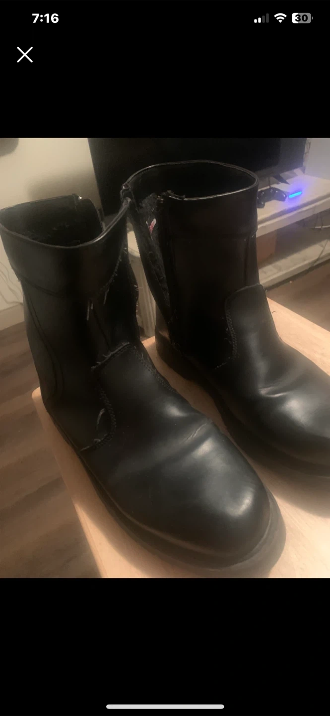These black boots are waterproof. They feature a side zipper for easy on and off. The soles have good tread for traction. Mens size 9.