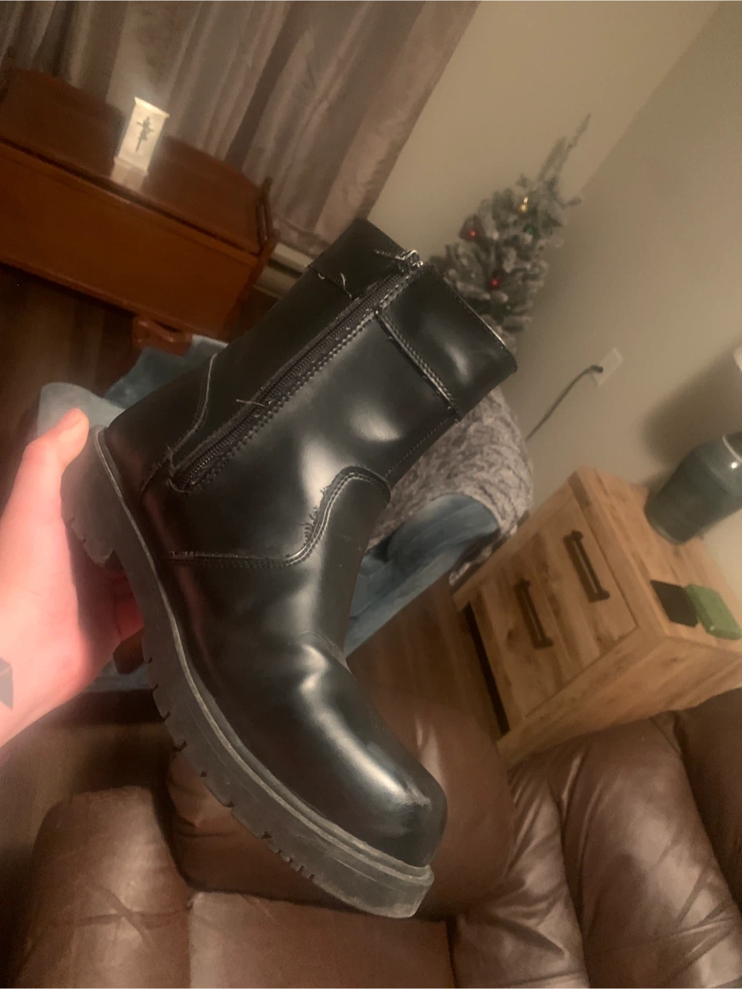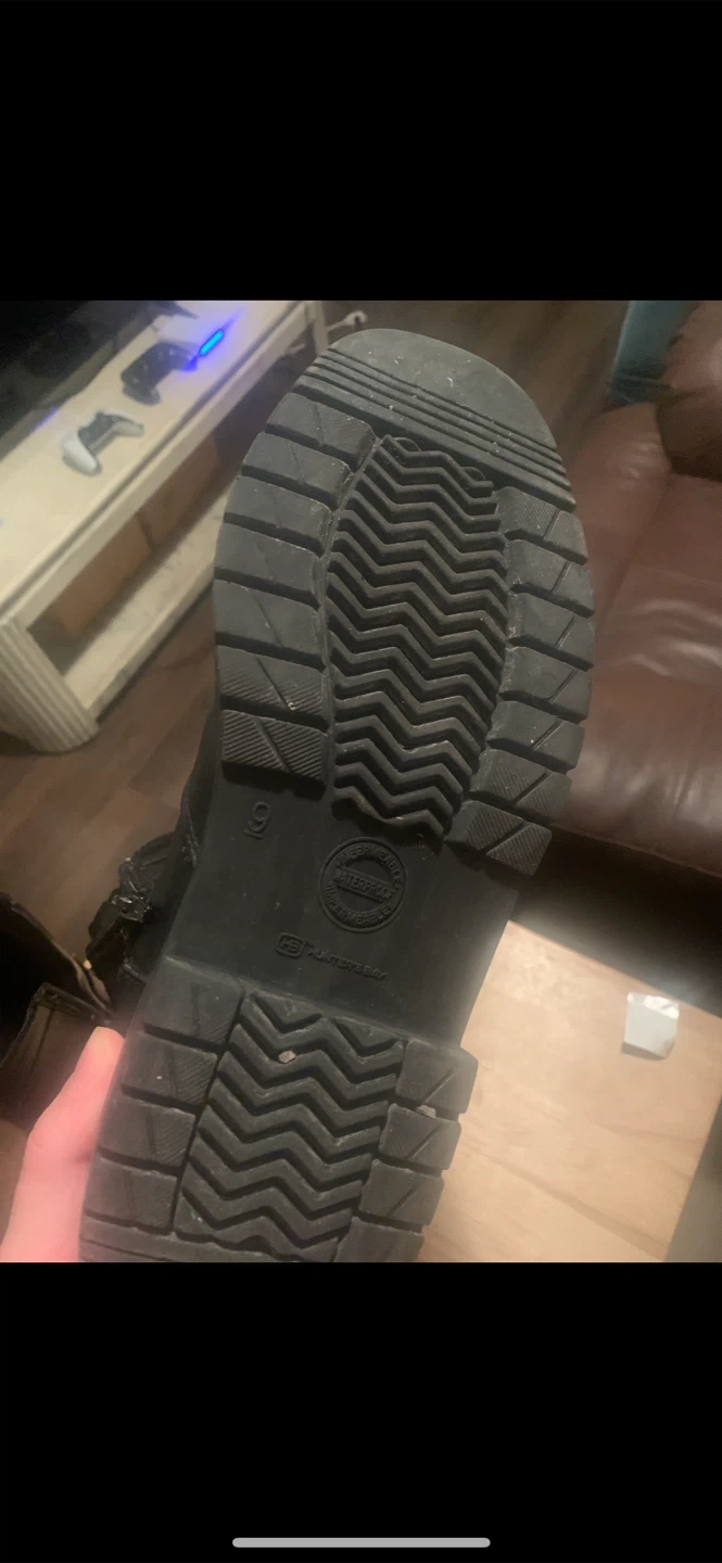 These black boots are waterproof. They feature a side zipper for easy on and off. The soles have good tread for traction. Mens size 9.