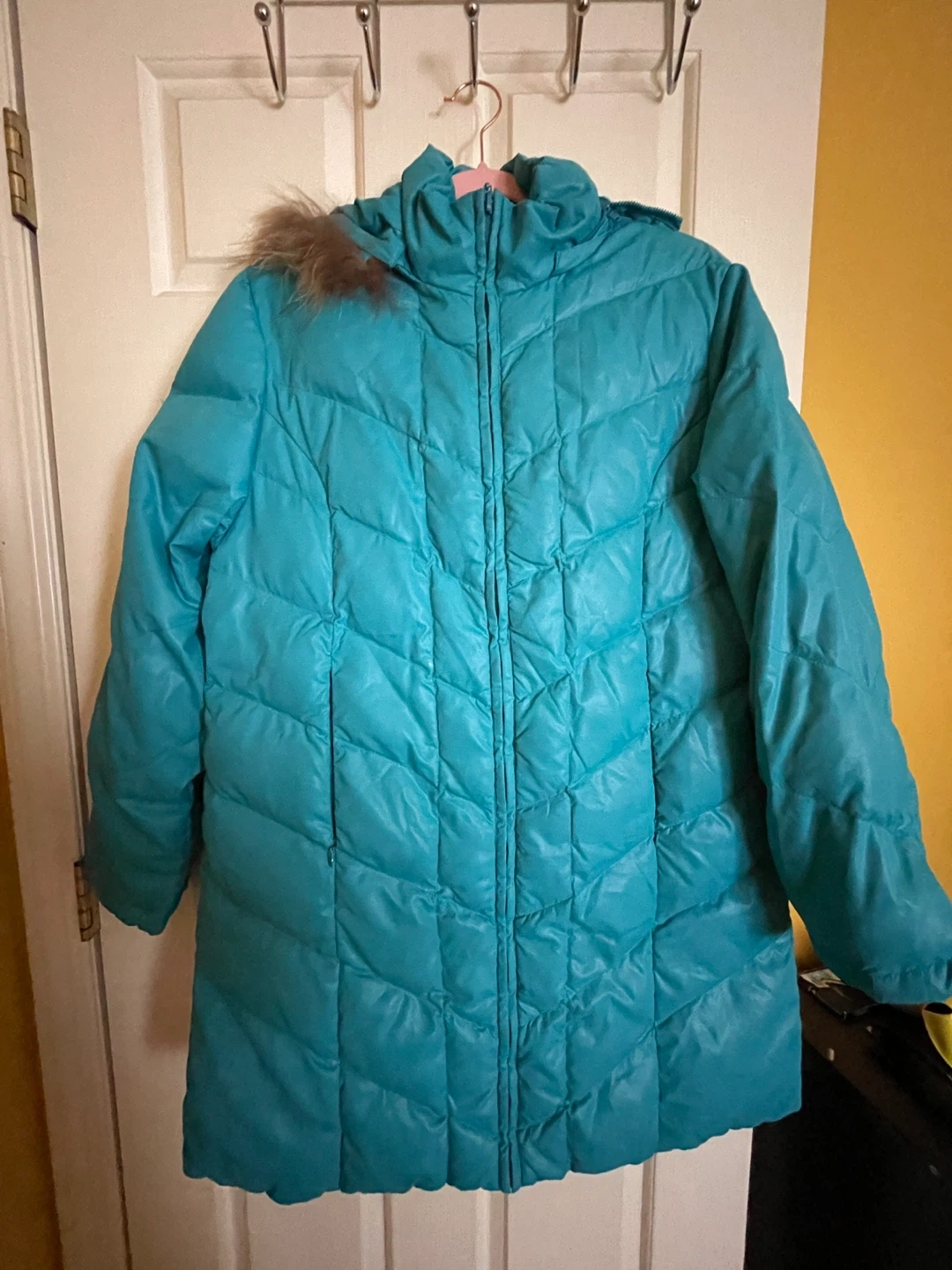 Looking to sell this teal puffer coat. It's in great condition and ready to keep you warm this winter! The coat features a faux fur trim on the hood and a quilted design.