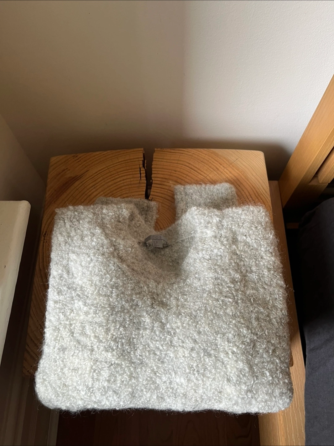 A thick wool and mohair light grey fuzzy COS sweater. A bit cropped. Officially a women’s extra-small. Unless you prefer a loose fit, it’s more like a women’s small or medium. I can still wear it now and I’m a women’s 8.