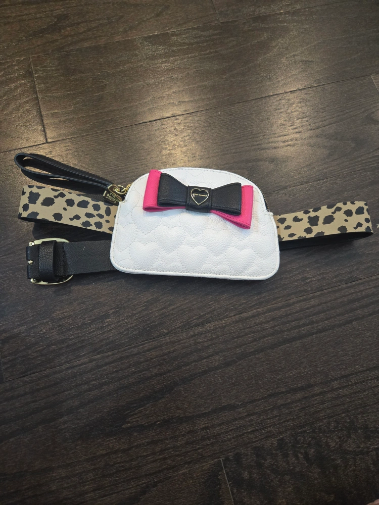 Selling a cute Betsey Johnson belt bag! It's white with a lovely heart pattern and a stylish bow. The bag comes with both a black belt and a leopard print belt, so you can switch up the look depending on your outfit