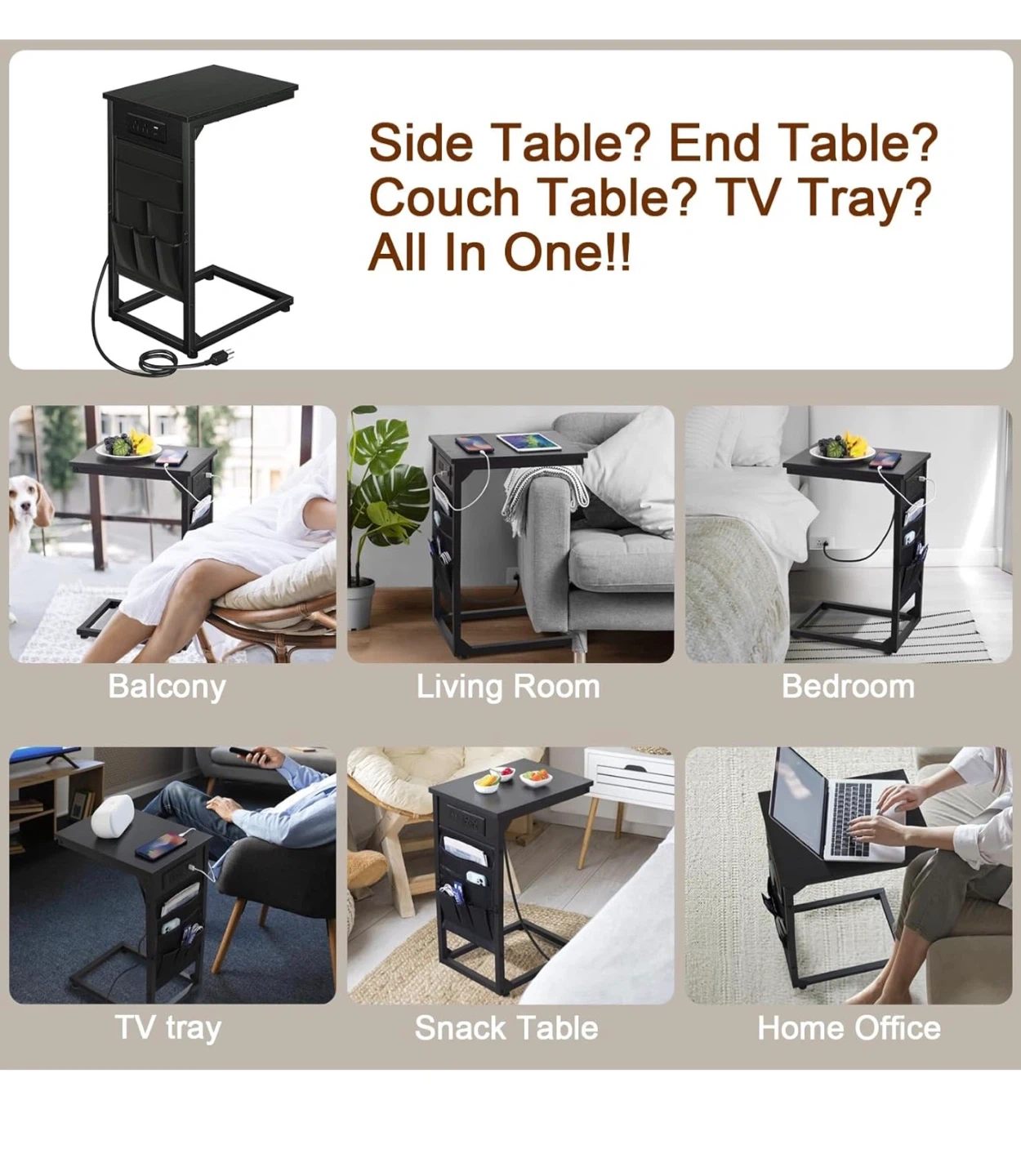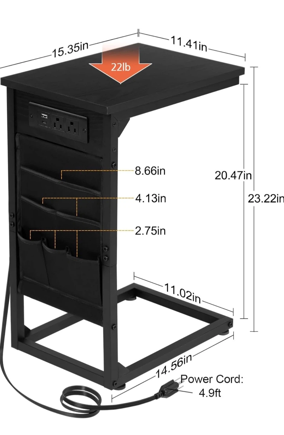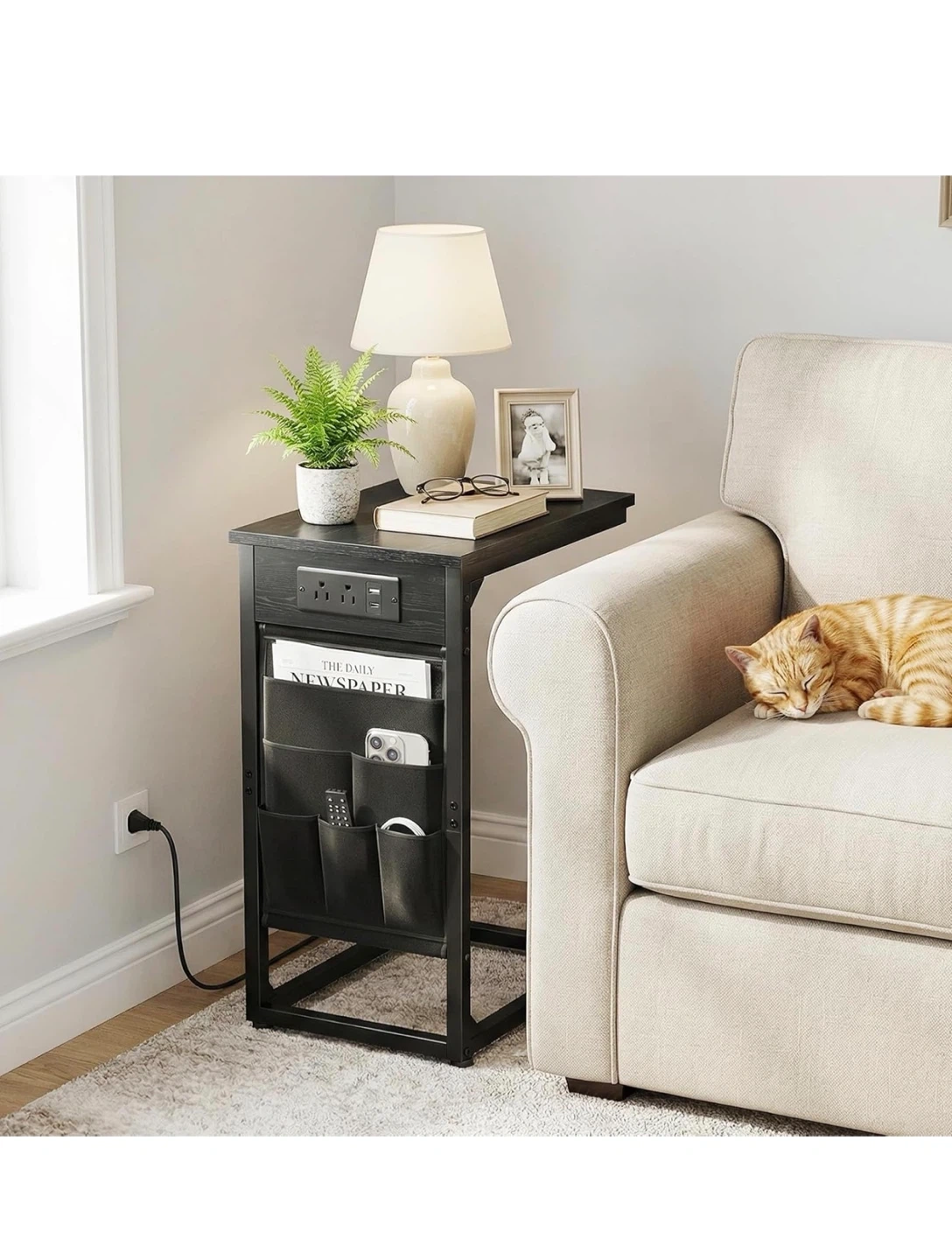 This C-shaped end table features two AC outlets and one USB port for charging devices. It's made with a black wood-grain finish and includes side storage pockets for magazines or remotes. The table's base slides under your couch for easy placement. It's perfect for keeping your essentials close by while you relax!