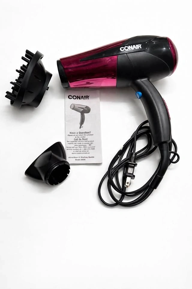 Complete Conair hair dryer model 295RC. Comes with the diffuser attachment, concentrator nozzle, and original instruction manual. Features 3 heat and 2 speed settings for all hair types, plus a cold shot button to lock styles. Works great!