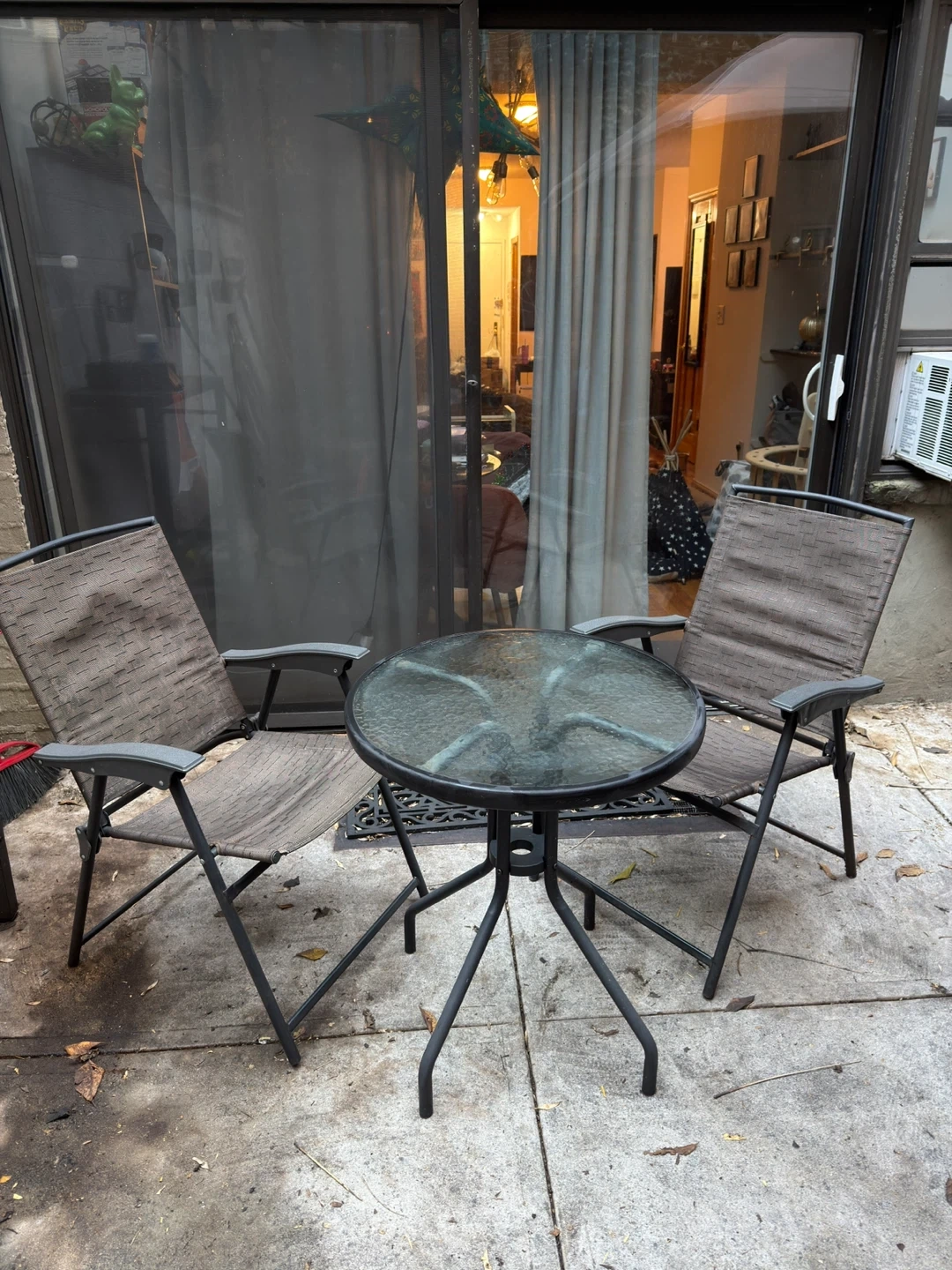 Selling a used outdoor patio set that includes a round glass table and two folding chairs. The chairs have a woven pattern and armrests. Great for a small balcony or patio space!