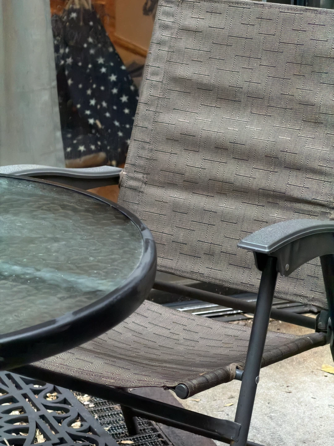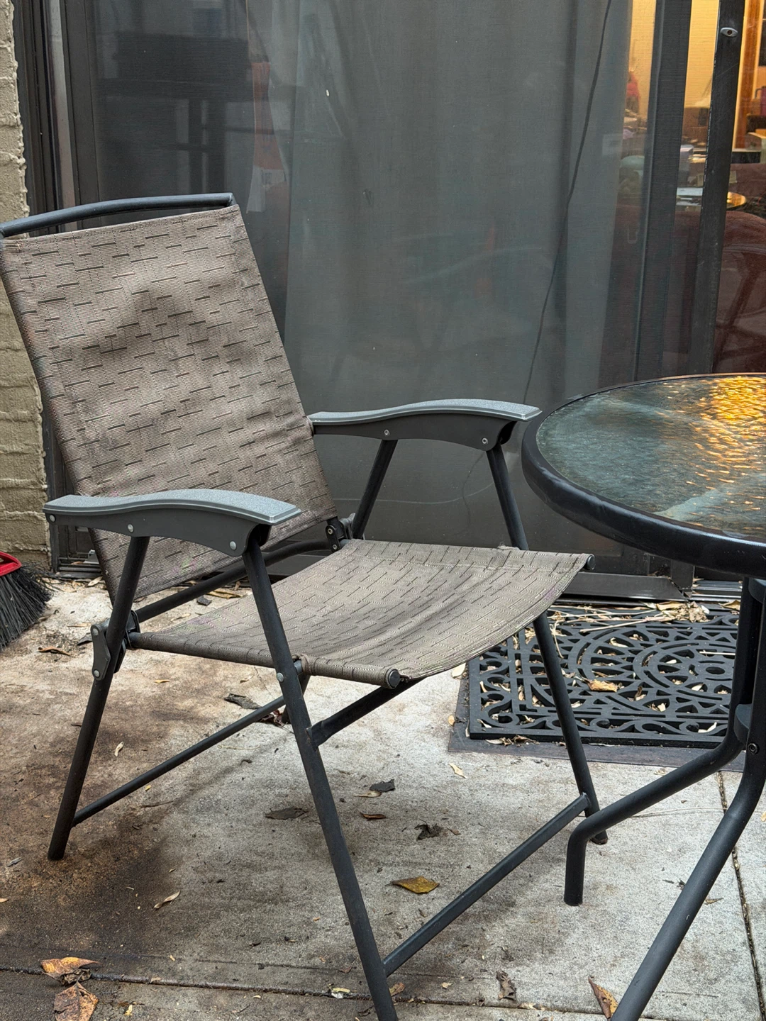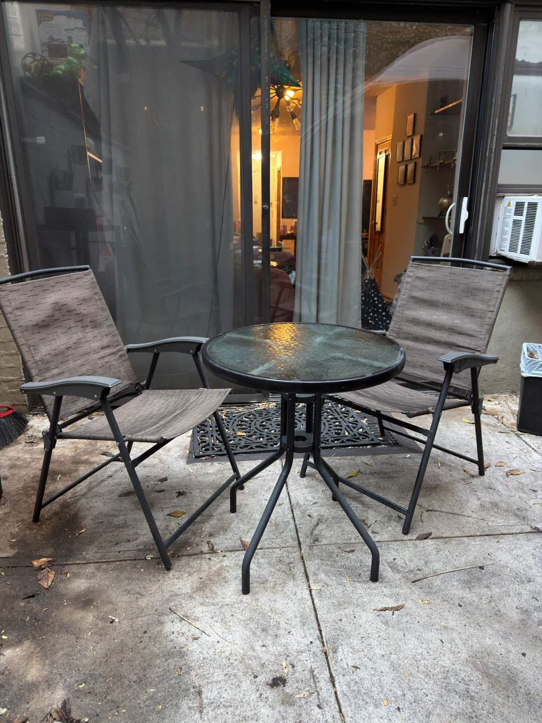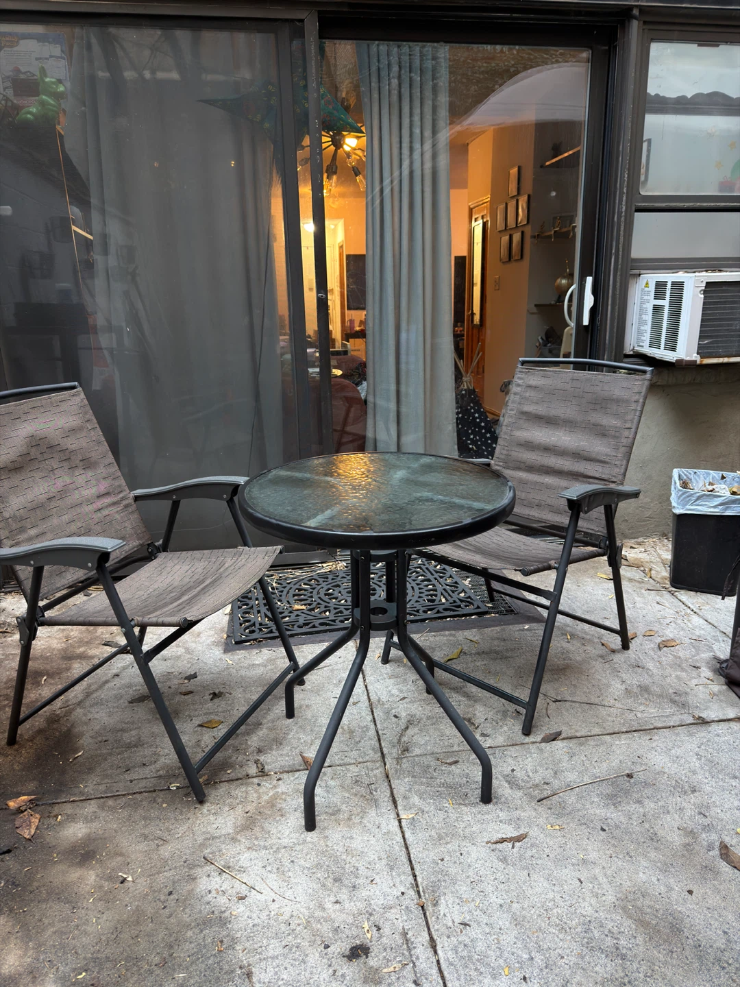 Selling a used outdoor patio set that includes a round glass table and two folding chairs. The chairs have a woven pattern and armrests. Great for a small balcony or patio space!