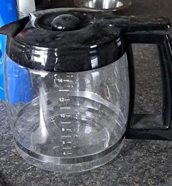 This is a replacement coffee carafe. It features clear measurement markings up to 14 cups. It has a comfortable black handle.
